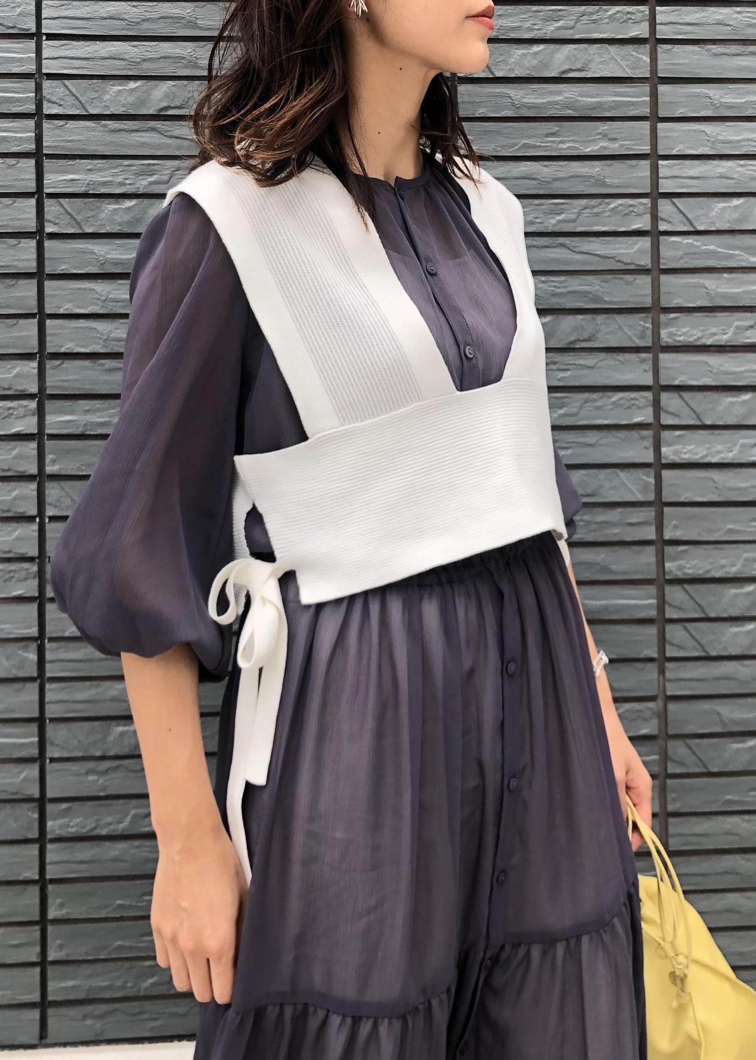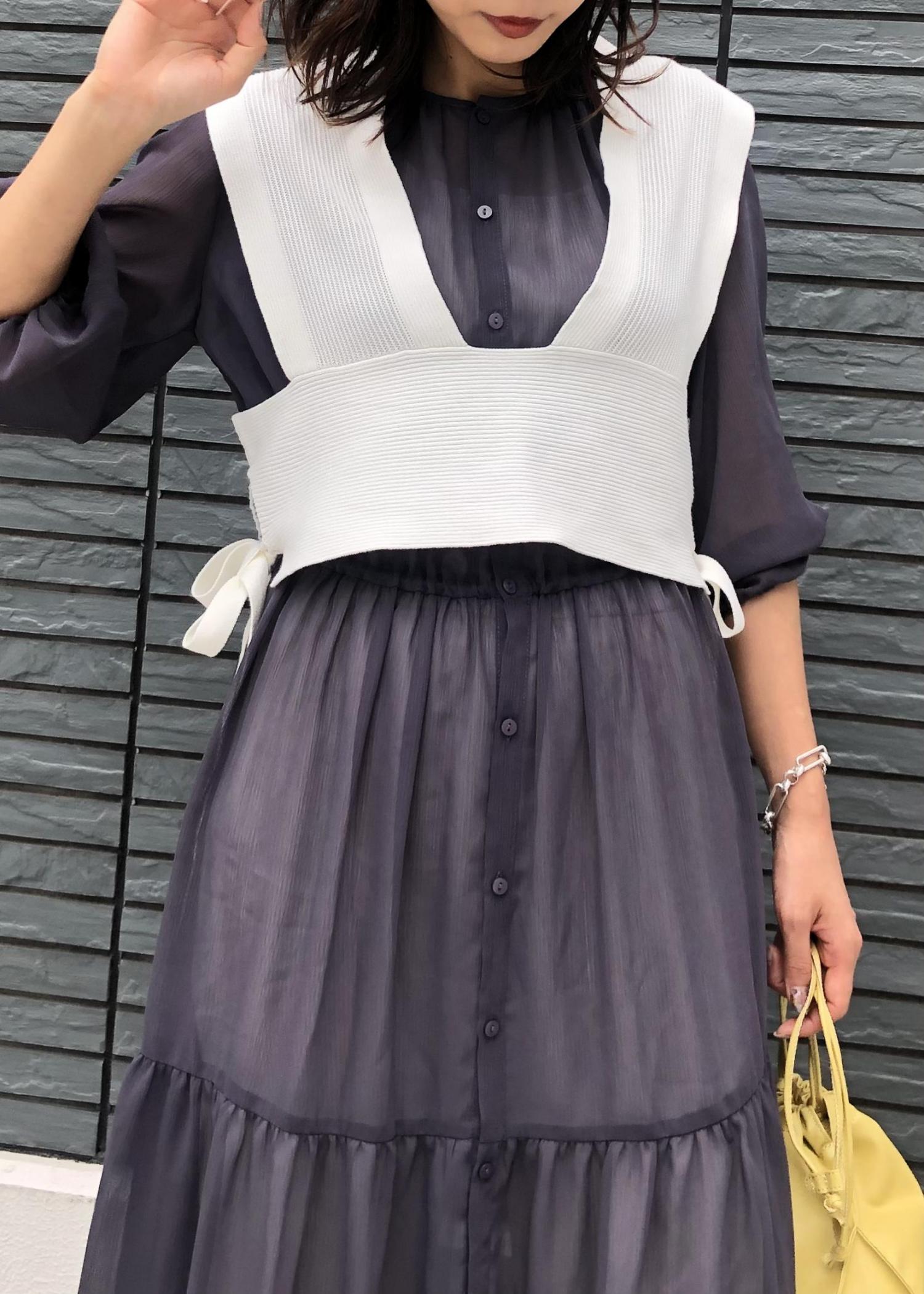 着丈の長いワンピースにショート丈ビスチェを重ねることで足長効果がでます! チャコールグレーのティアードワンピは、女性らしいかわいさもありつつ大人な上品さも演出できます! ビスチェ、ワンピ、パンツと着回し力抜群なのでこの夏活躍間違いなしです!