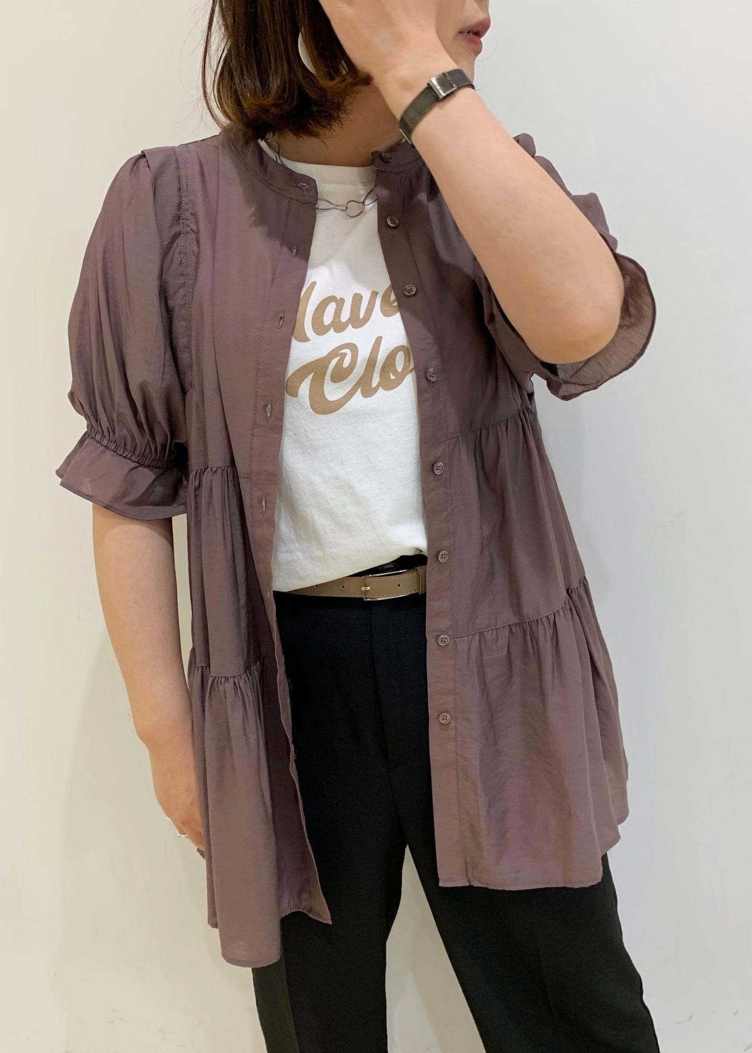 トレンド感たっぷりのティアードブラウスを取り入れたコーディネート♪ ティアードブラウスは可愛らしいデザインなので、インナーにはあえてロゴの入ったカジュアルTを合わせ甘辛コーデに仕上げました☆! 今回は羽織りとして合わせてますが、前後2Wayでも活用でき、コーディネート幅が広がるアイテムです◎
