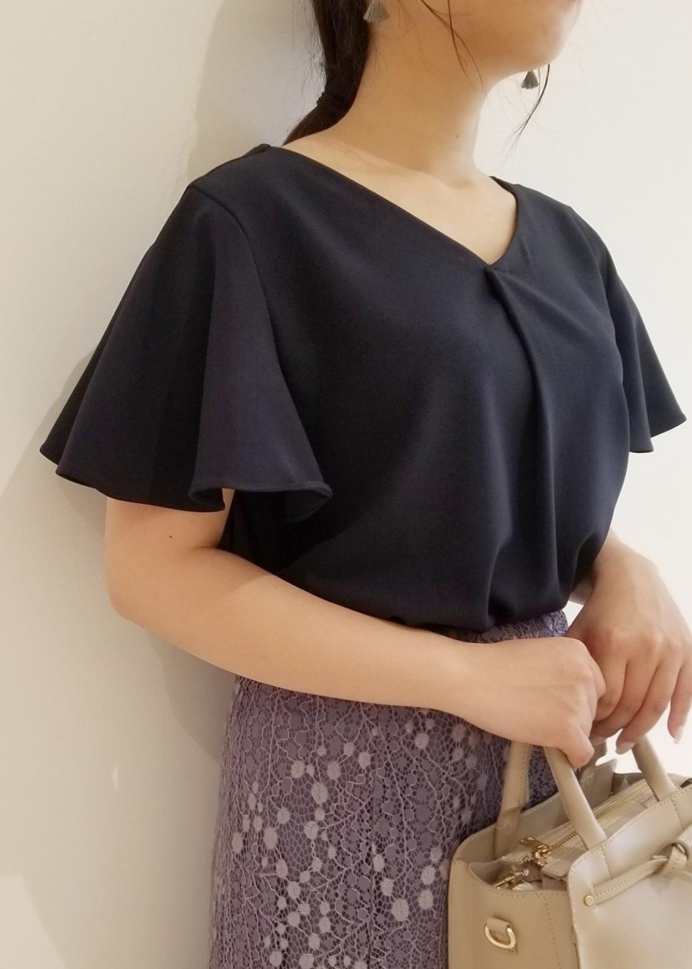 落ち着いた色味のブラウスと華やかなレーススカートを合わせたお仕事着コーディネートです。 レーススカートはTシャツやスエットなどのカジュアルアイテムと合わせてもお洒落な雰囲気で着用出来ます!
