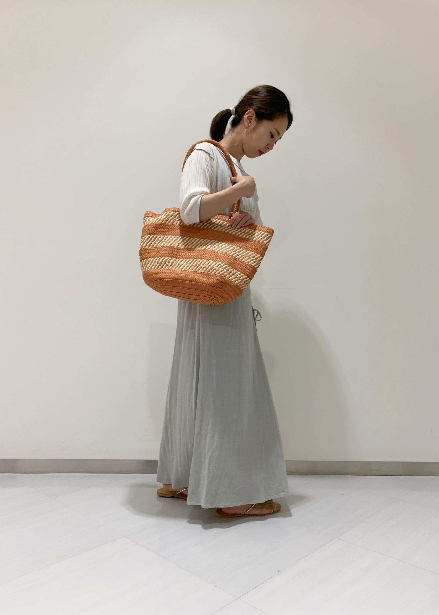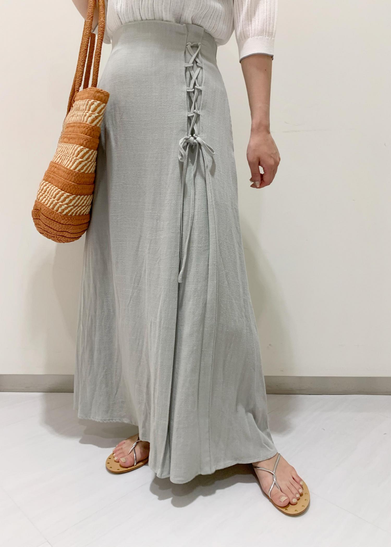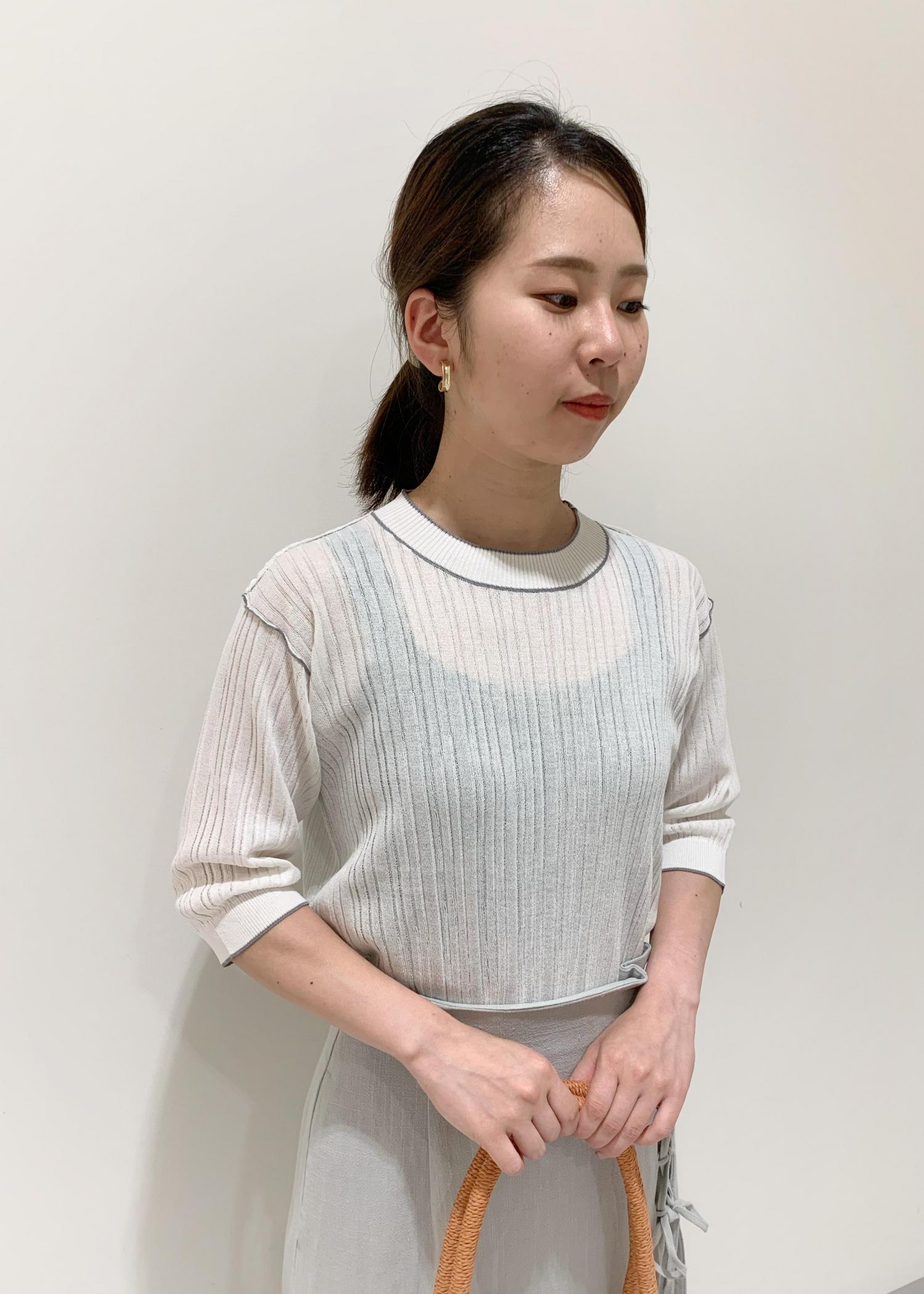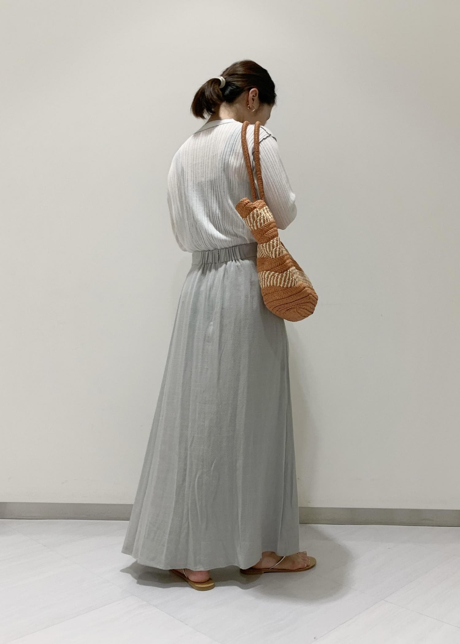 夏でも涼しく着れるシアーニットです。スカートも麻混でシャリ感があり、湿度の高い季節にもオススメです。