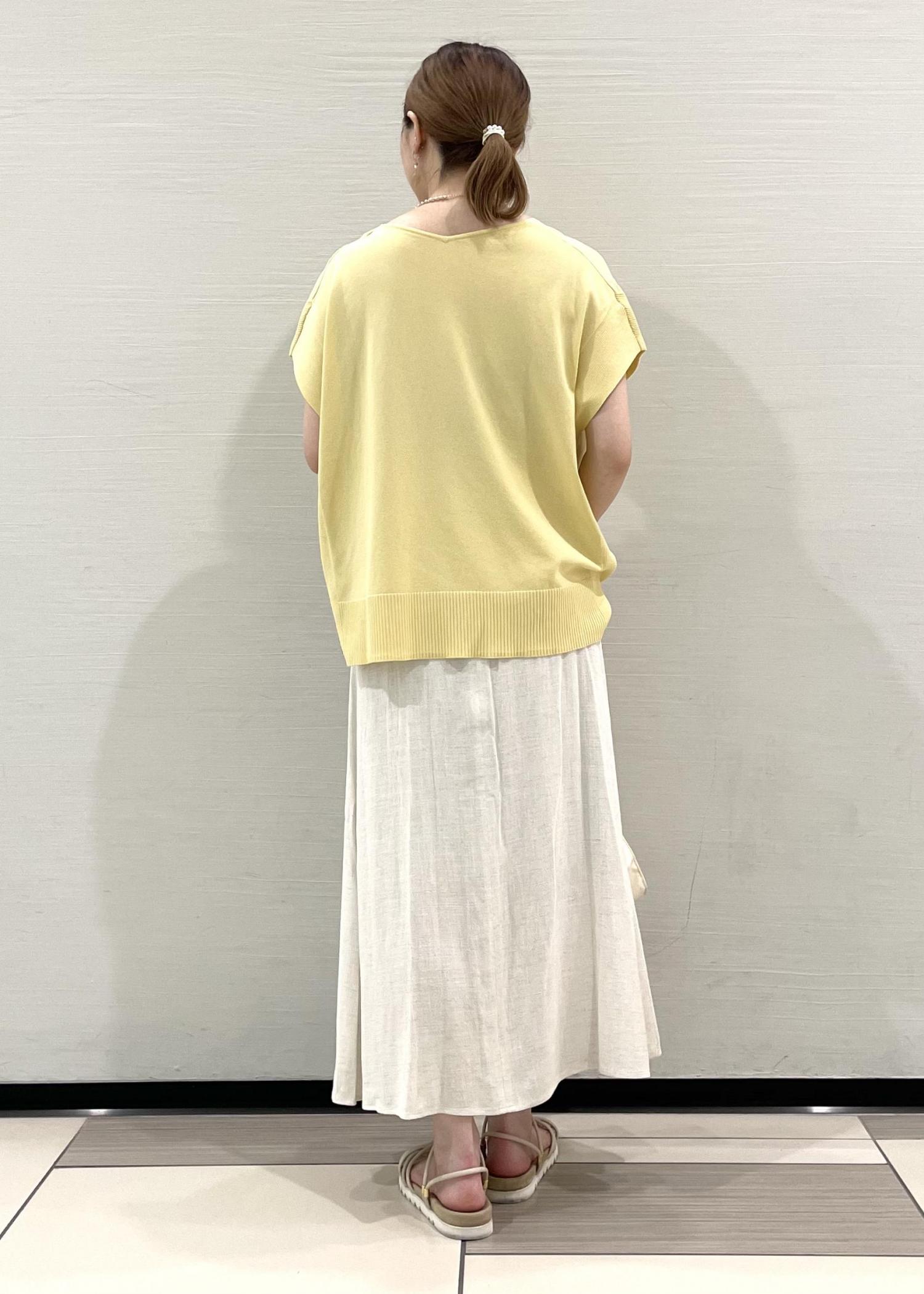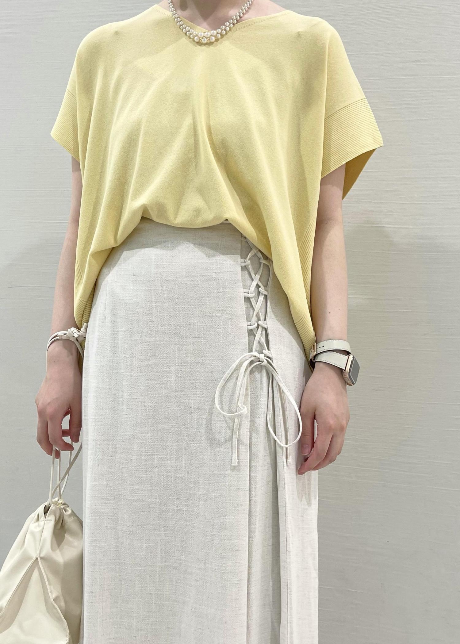 イエローのトップスとレースアップディテールがかわいいスカートで大人かわいいコーディネートに仕上げました。 合わせる小物によってキレイめなコーディネートにもなり、万能なおすすめコーディネートです!