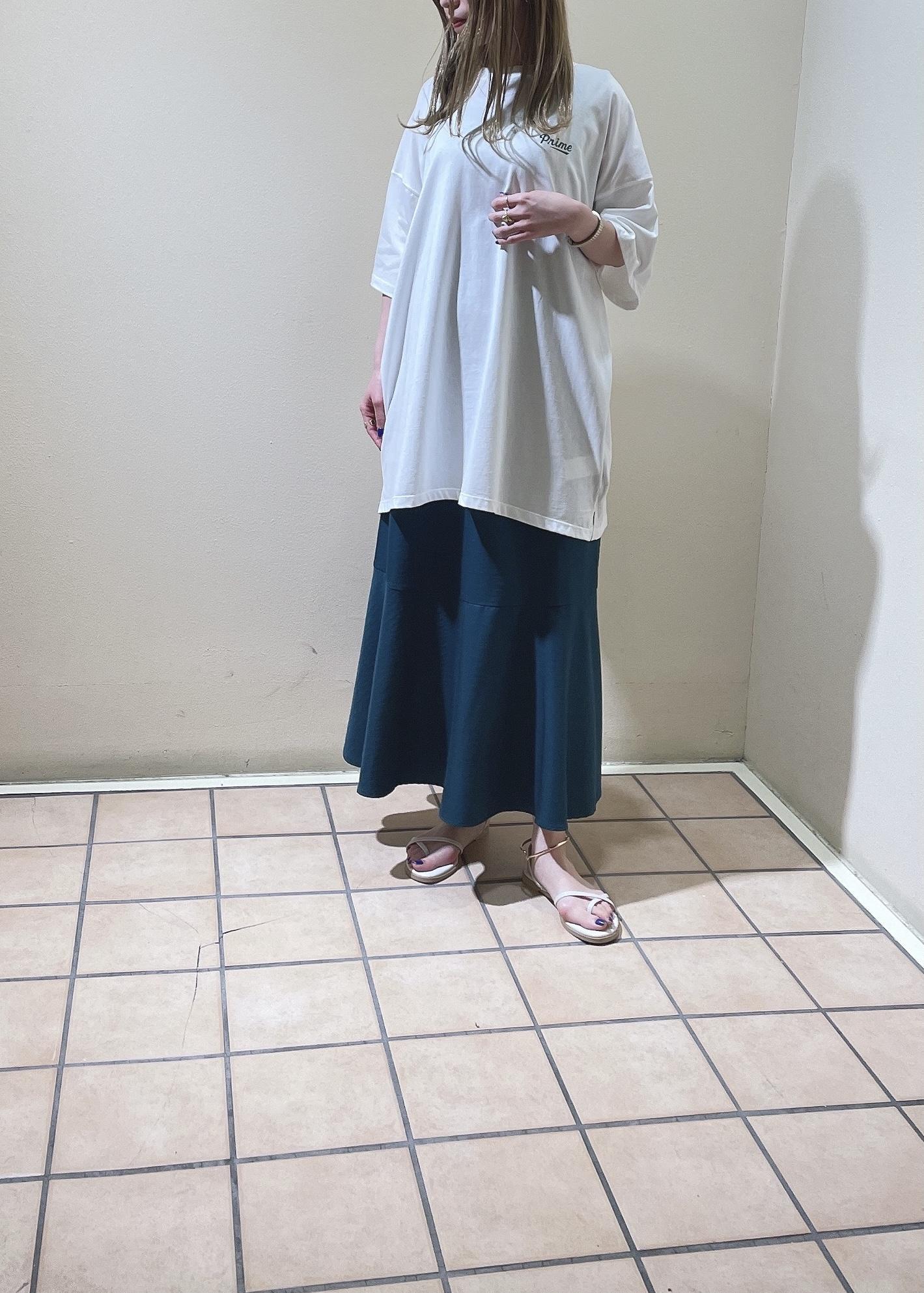 ゆったりとしたカジュアルなTシャツにキャミワンピースをスカート見せし合わせてみました。マーメイドシルエットのワンピースとTシャツを合わせる事でカジュアルすぎず女性らしくも着ていただけます。