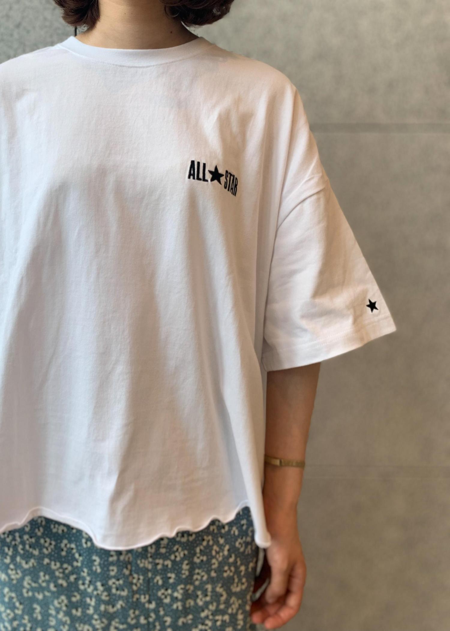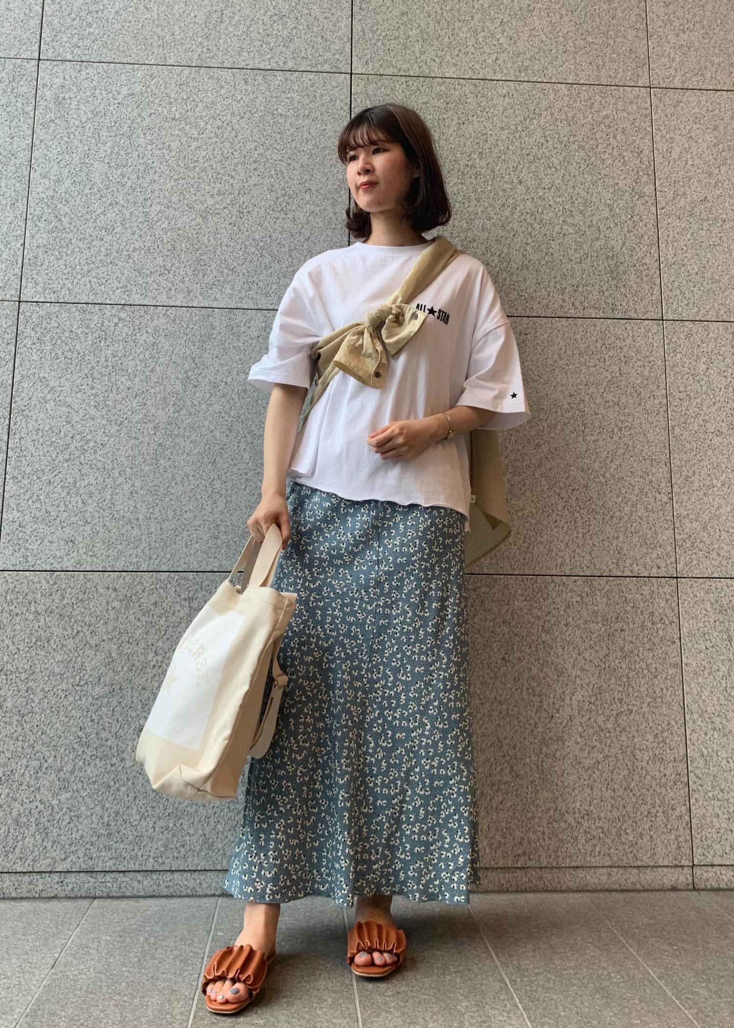 converseをメインにカジュアルな雰囲気を出しつつ、ボトムは花柄のマーメイドスカートを合わせて女性らしさもプラスしたコーディネートにしました。
