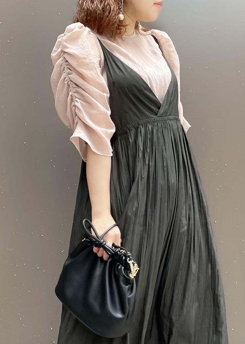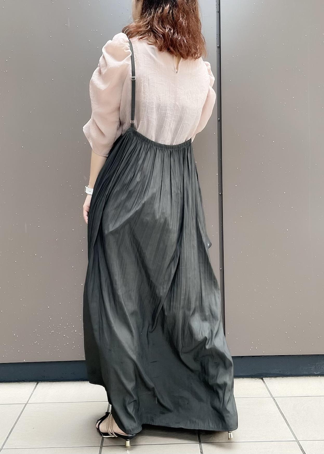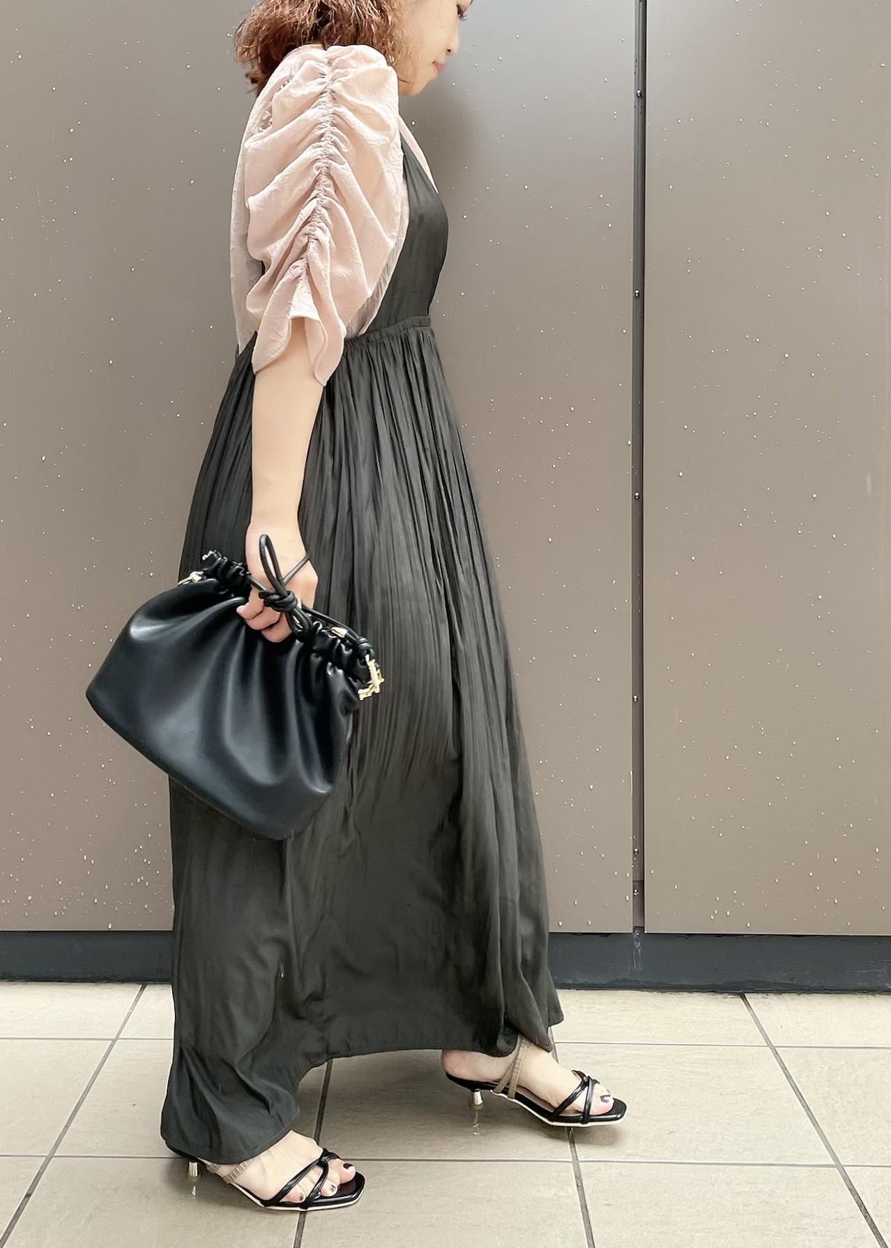 フェミニンなシアーブラウスに程良い艶感のあるキャミワンピを合わせて女性らしいスタイリングにしました・:*+. シルエットやアイテムは女性らしい印象ですがキャミワンピが墨黒で少し落ち着いた雰囲気になるので甘くなり過ぎず大人の女性にも楽しんで頂けるコーディネートですよ☺︎