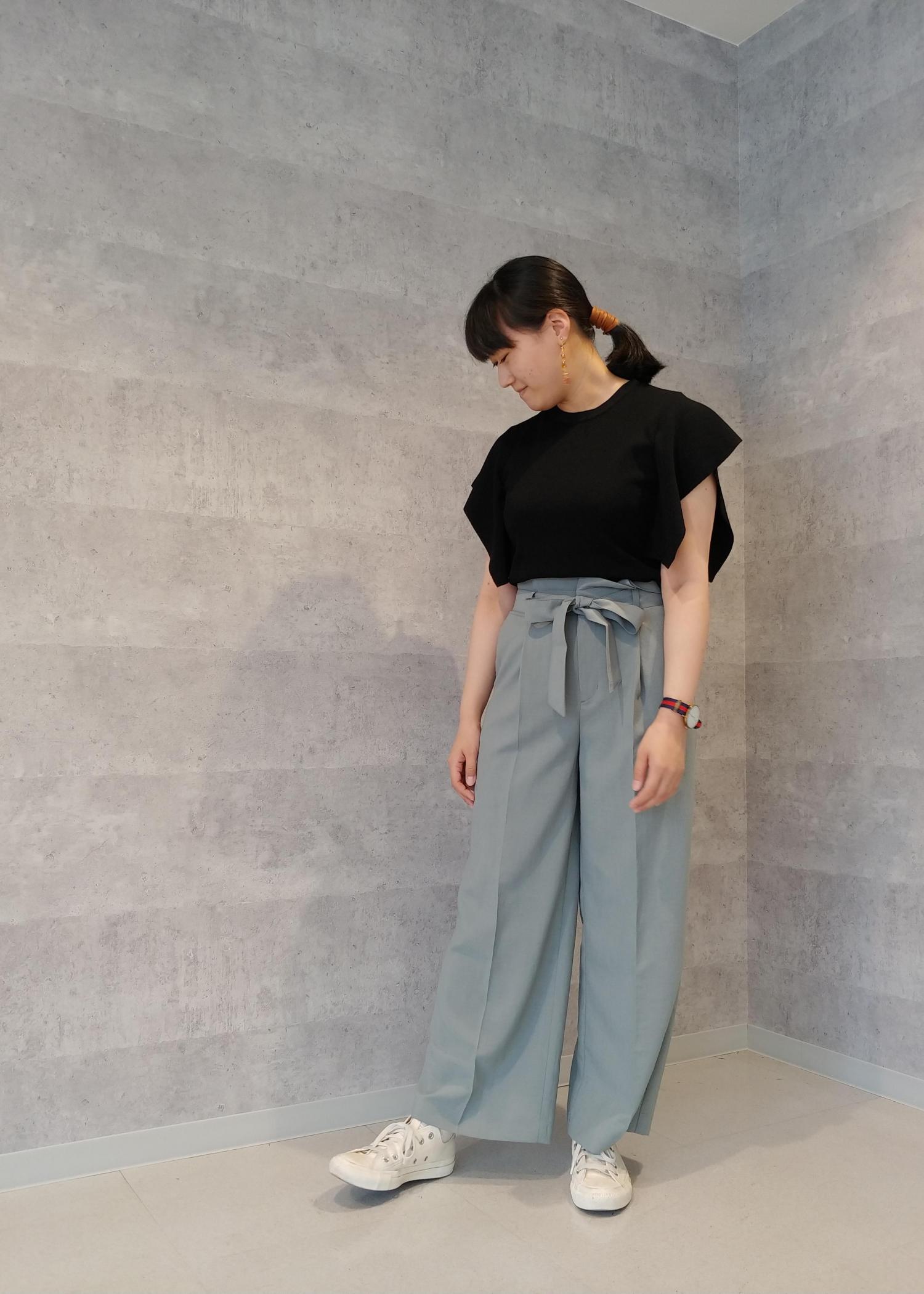 ワイドパンツにトップスはすっきりとしたトップスでバランス良く着こなしてみました。ブラックを選ぶことで、大人っぽさも出してみました。