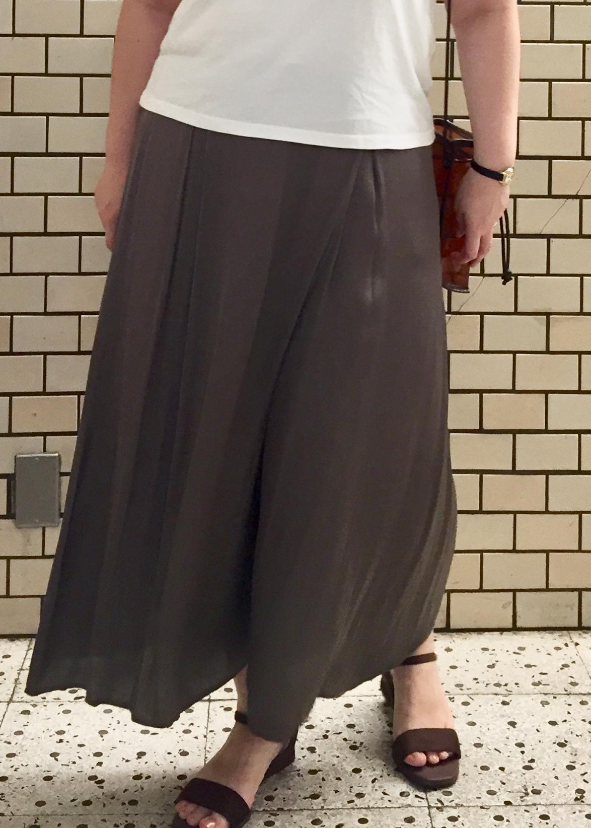 落ち着いたブラウンのオータムカラーコーデです! ラフィアハットの小物合わせで夏らしい着こなしになっています。 楽チンきれい見え ♪ のスカーチョはオンオフで着回しができるのでオススメです!
