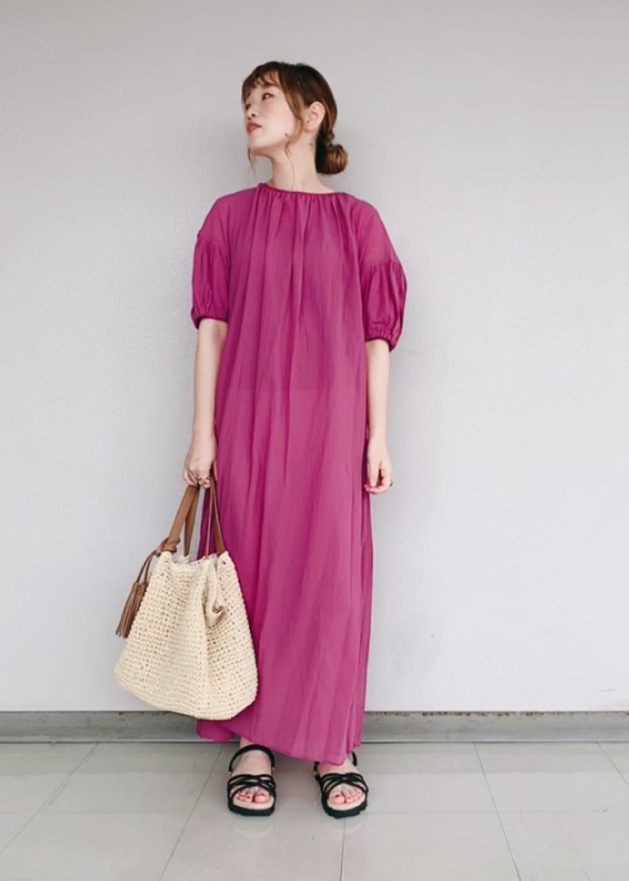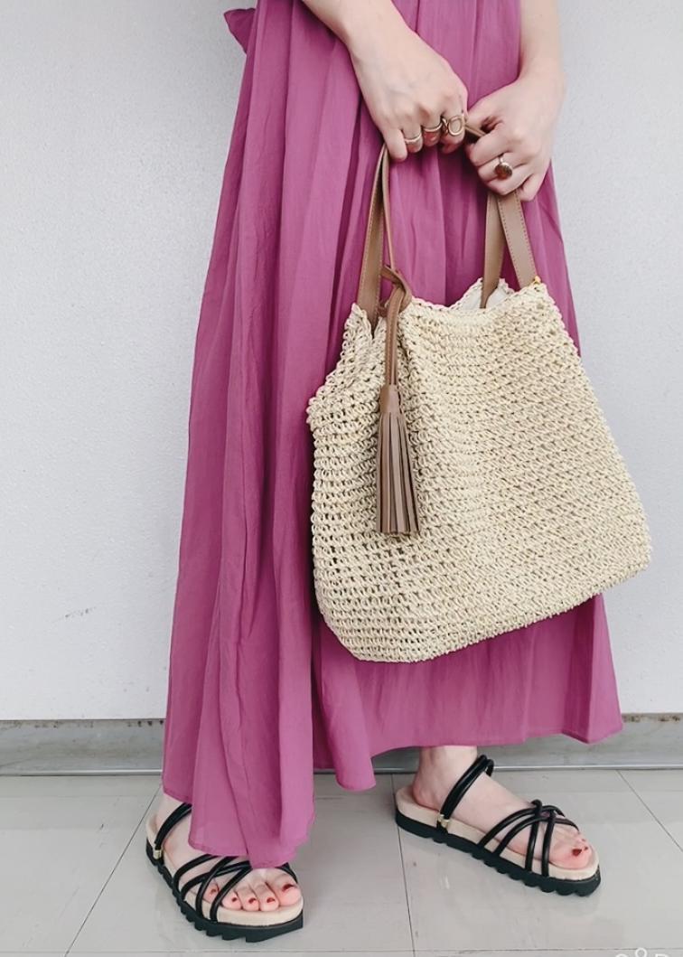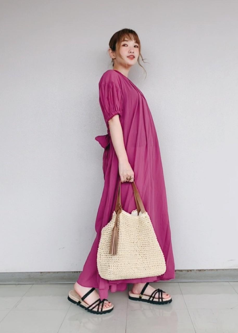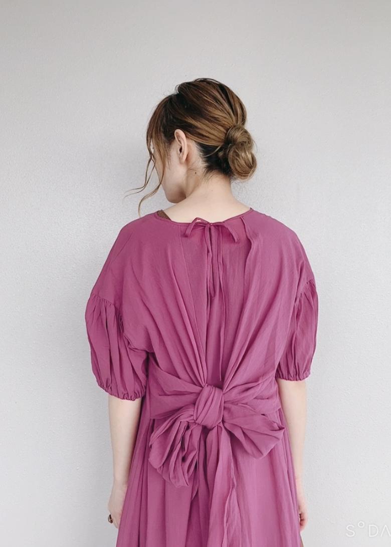 ビビットなピンクが華やかな、マルチウェイワンピースは、大きめなウエストリボンの結び方を前後、左右とアレンジできます。私は背中で結び、正面から見た時にスッキリと見えるスタイリングにしています。