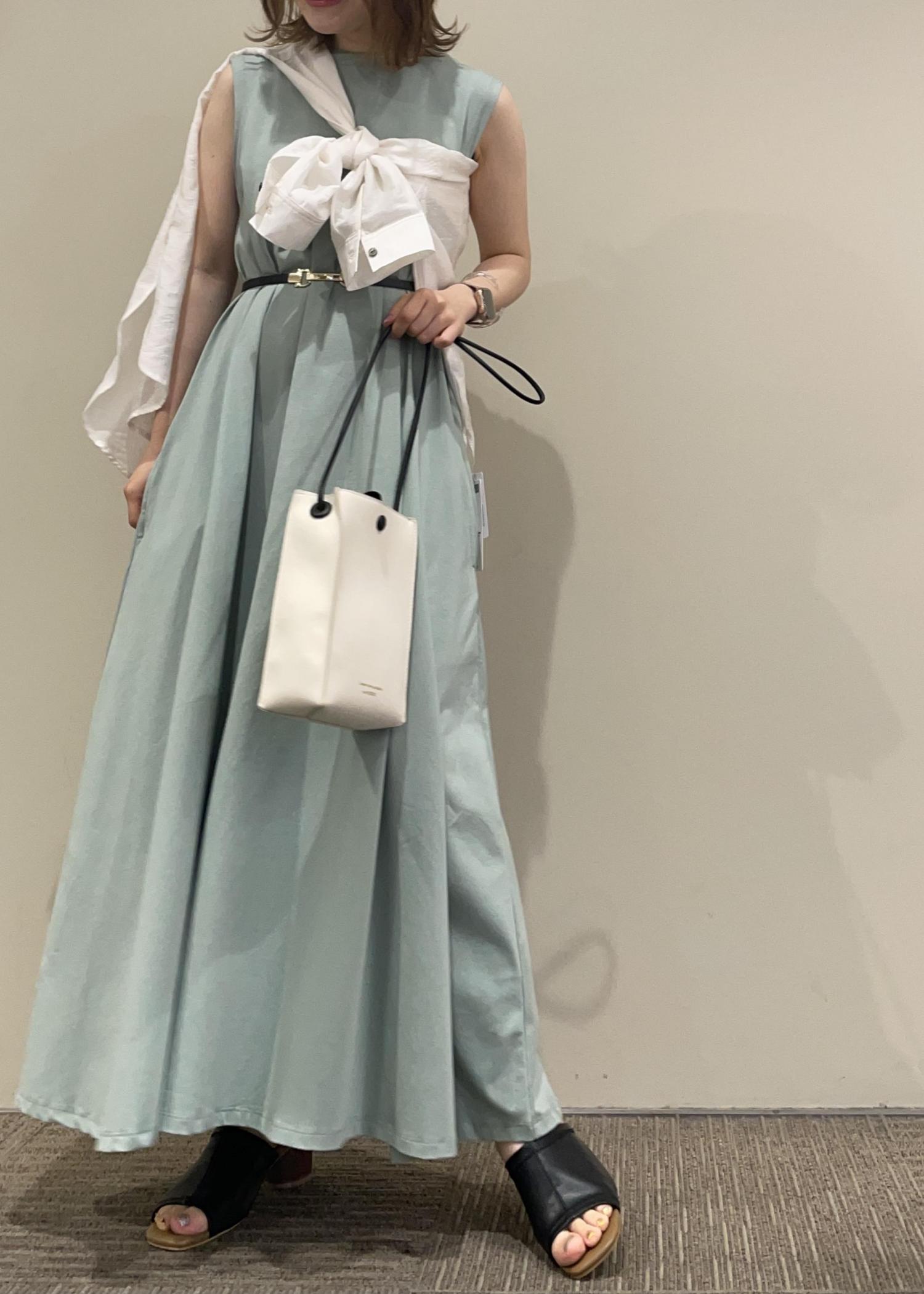 ライトグリーンの夏らしいワンピースは、きれいなAラインですっきり着れます! シンプルなので、シアーシャツをワンポイントに、トレンド感のあるコーデに仕上げました◎