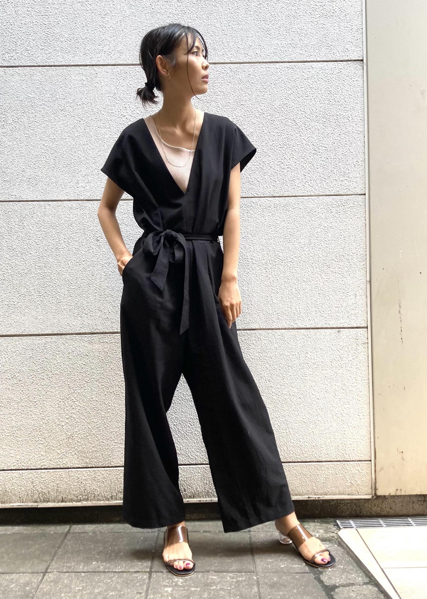 大人の中にもリボンで可愛らしく、女性らしい印象にしています。また足元のクリアサンダルで夏らしく、重すぎないコーデとなっています。