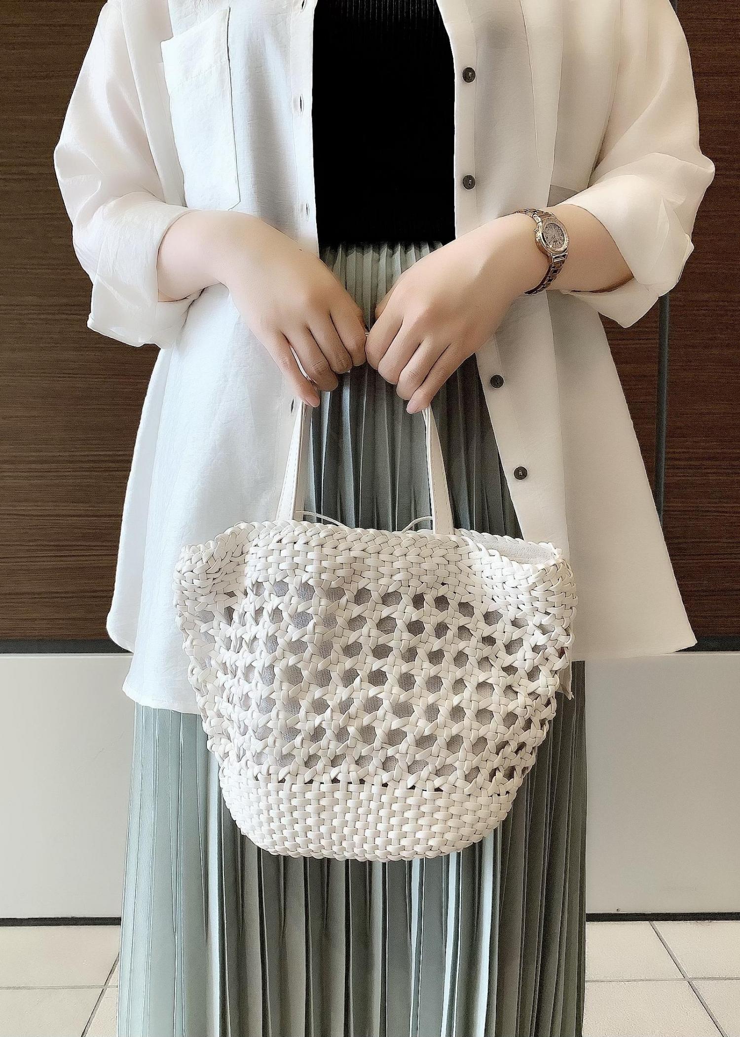 ライトグリーンの夏らしいカラーのスカートに雑貨のカラーも洋服に合わせてグリーンとシロに統一したことで涼しげな印象にしました。 トップスはシンプルなので、シアーシャツをワンポイントに、トレンド感のあるコーデに仕上げました。