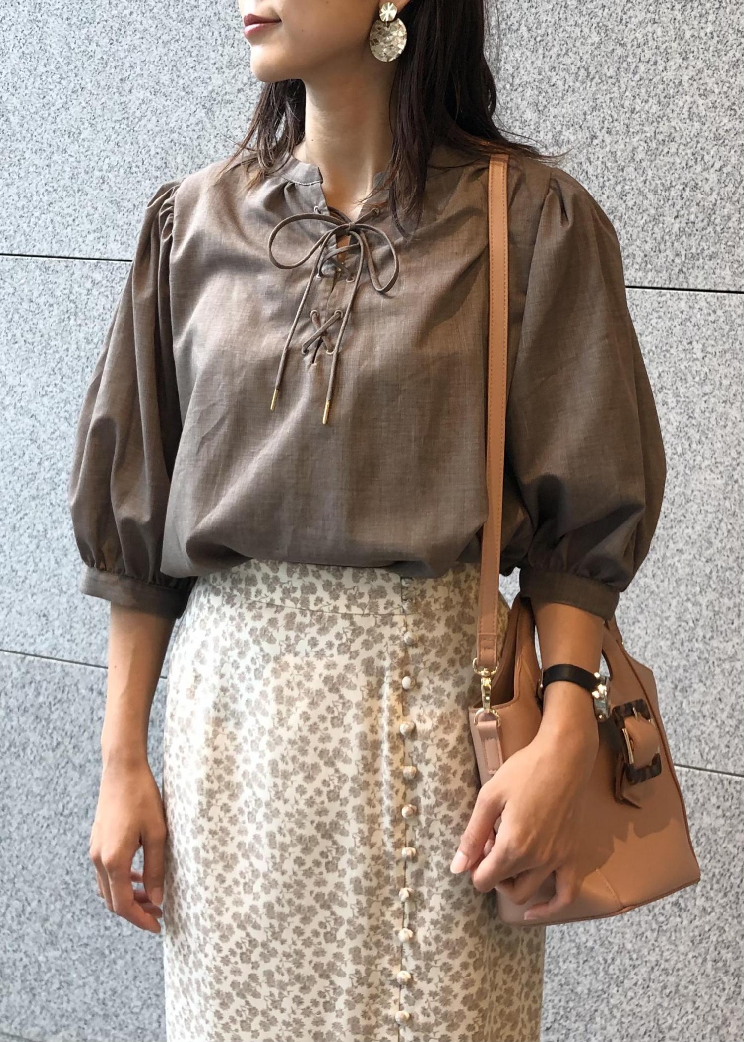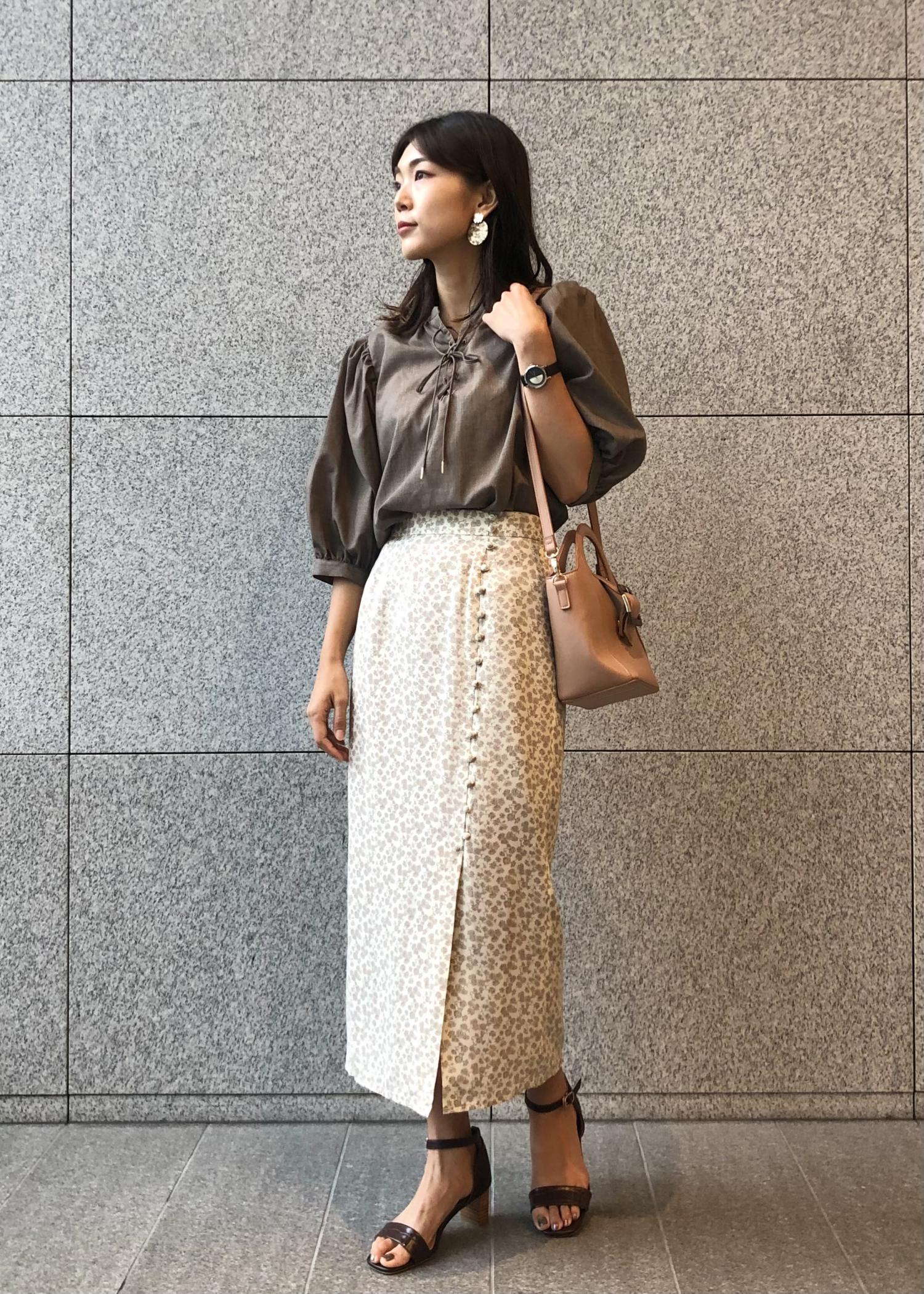 ボリュームトップスを合わせることで、スカートのシルエットがよりすっきり見えするためスタイルアップになります。