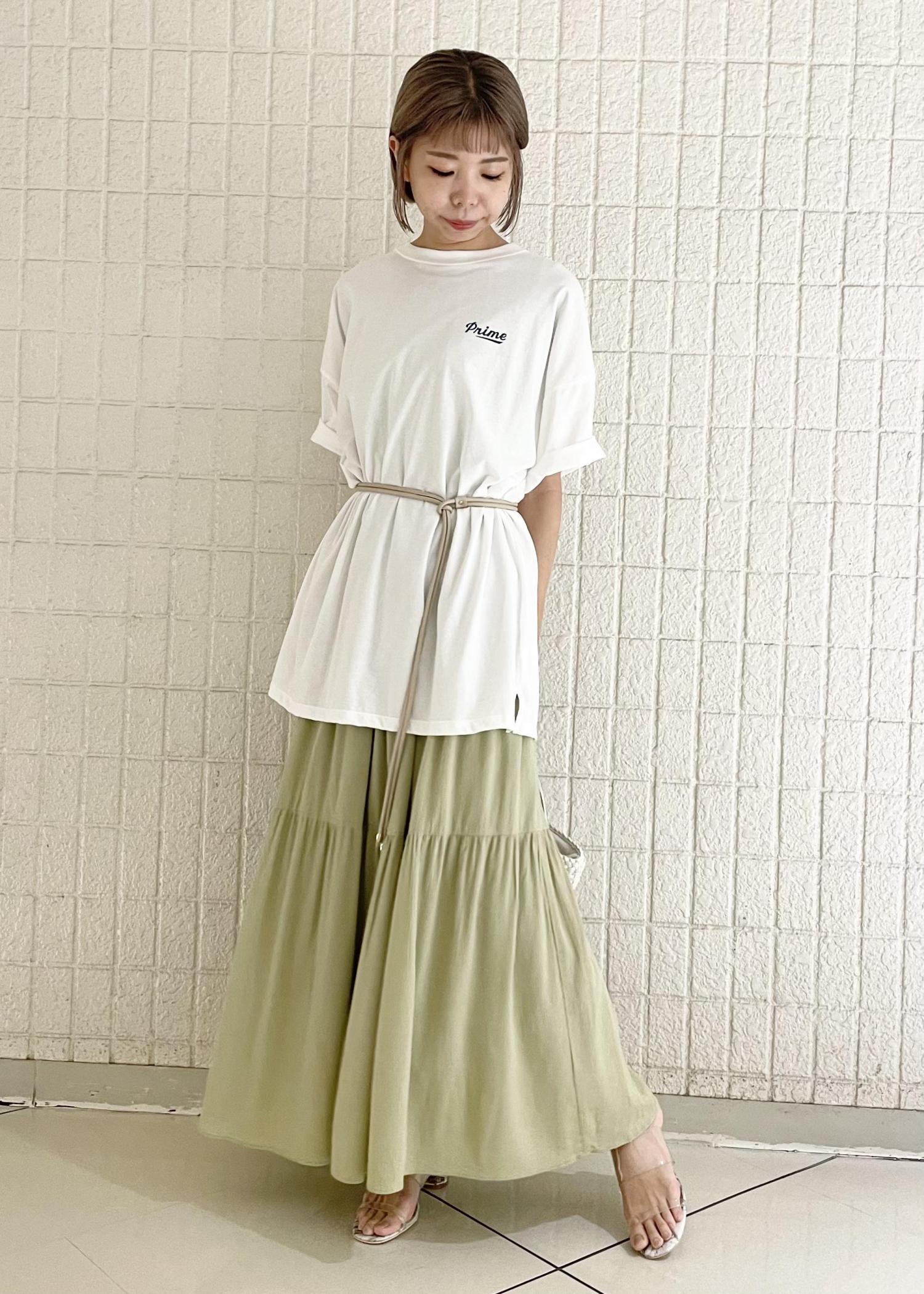 シンプルなTシャツなのでワンピースとレイヤードして女性らしいリラックス感のあるコーディネートにしました。