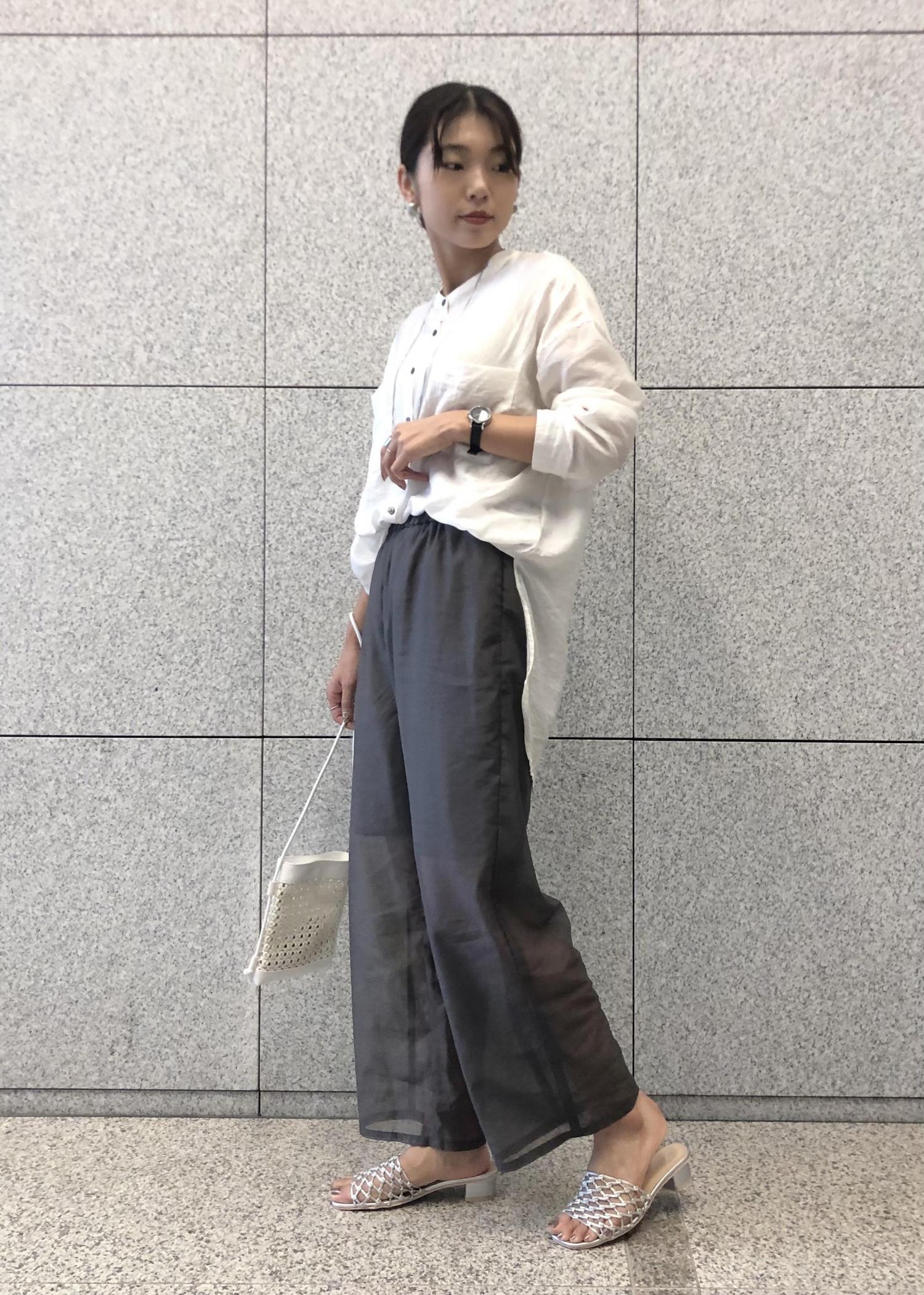 少しふわっとしたシルエットなので、トップスを合わせる際はシャツやコンパクトトップスを合わせることでルーズになりすぎずに着ていただけます。