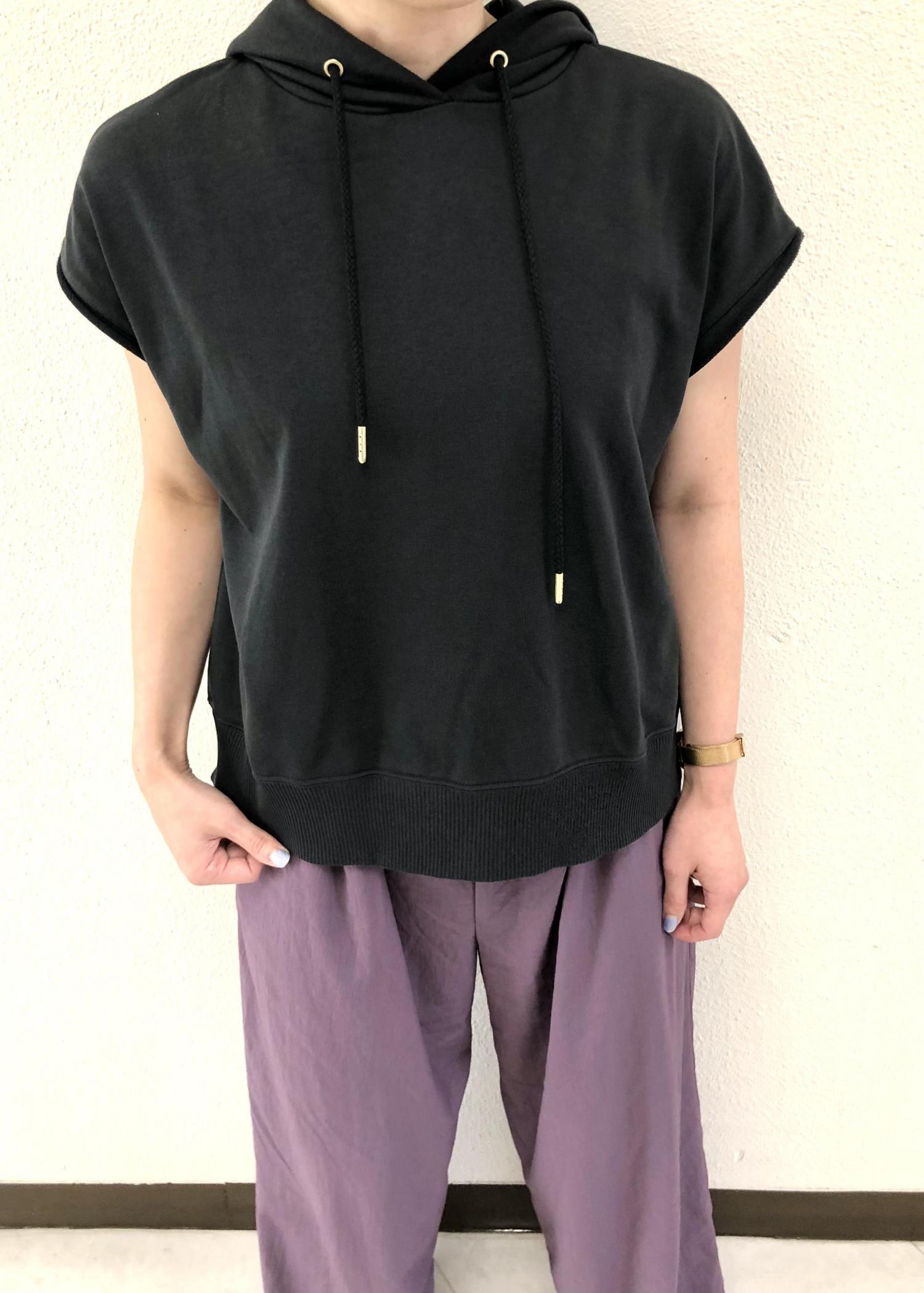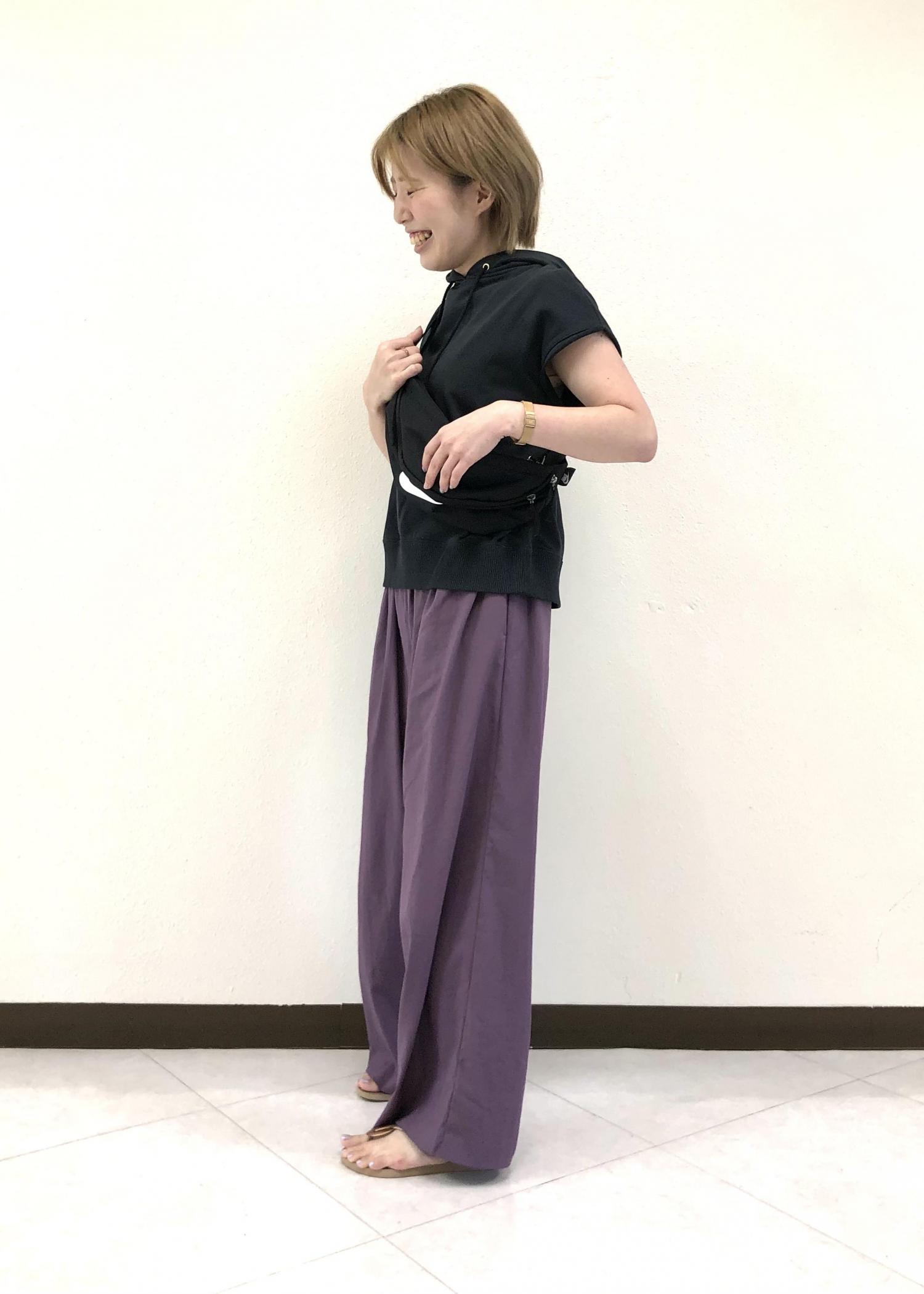 綿素材のパーカーにレーヨンナイロンのパンツと合わせたカジュアルテイストな仕上がり。 ちょっとしたお出かけをイメージしたコーディネートです。