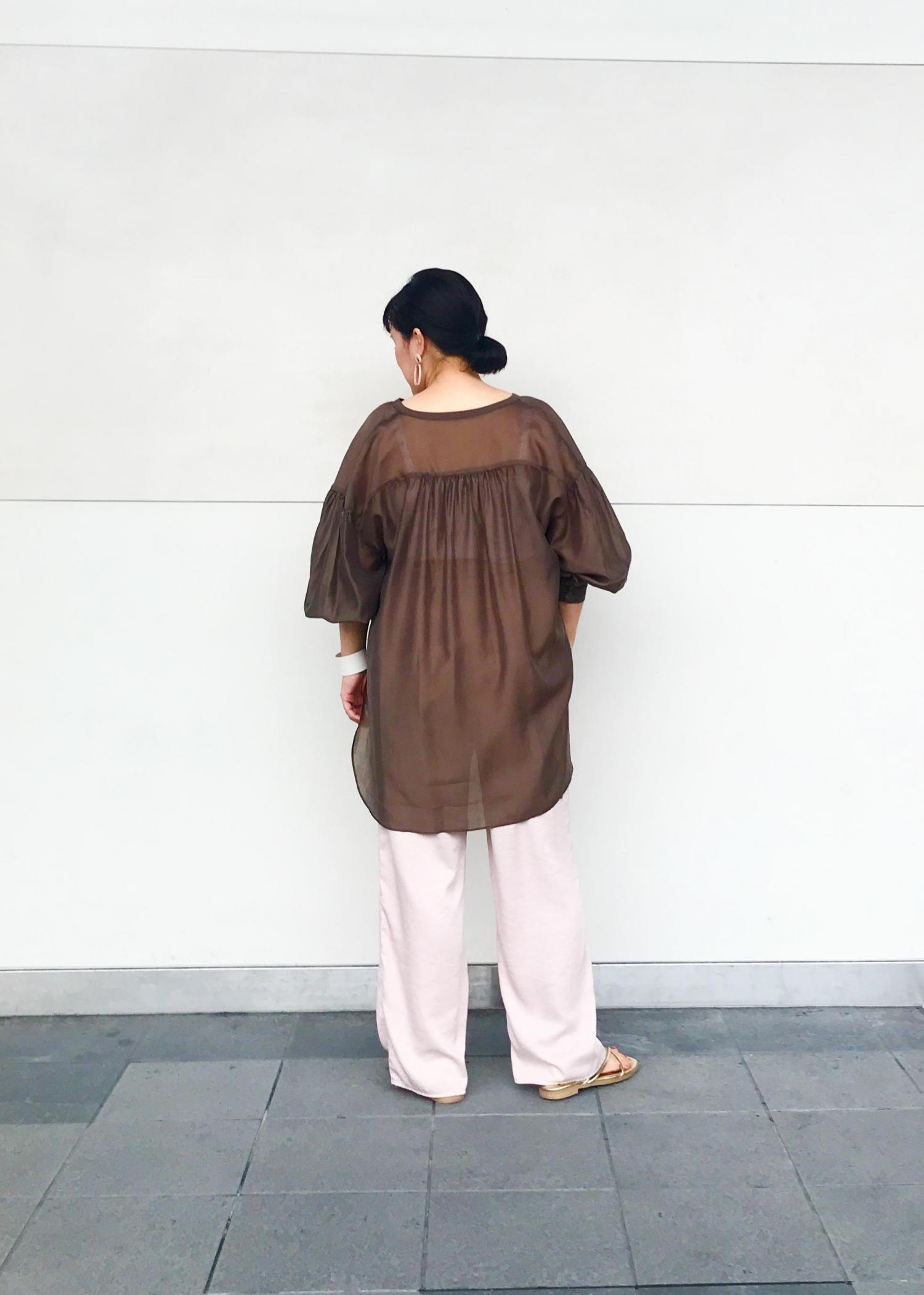 羽織でも着られるシアーシャツを、 1枚で着用してみました♪ 袖がボリュームがあり、 透け感のあるシアーシャツです! シンプルな中にもトレンドをしっかり抑えたシャツなので、 1枚でもオシャレです◎ パンツもウエストもゆったりで、 とてもリラックスできます♪