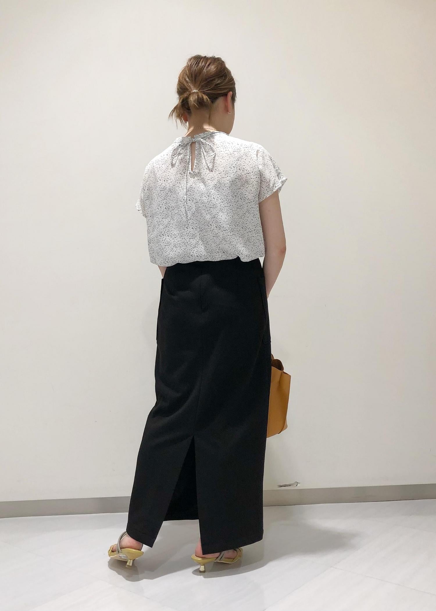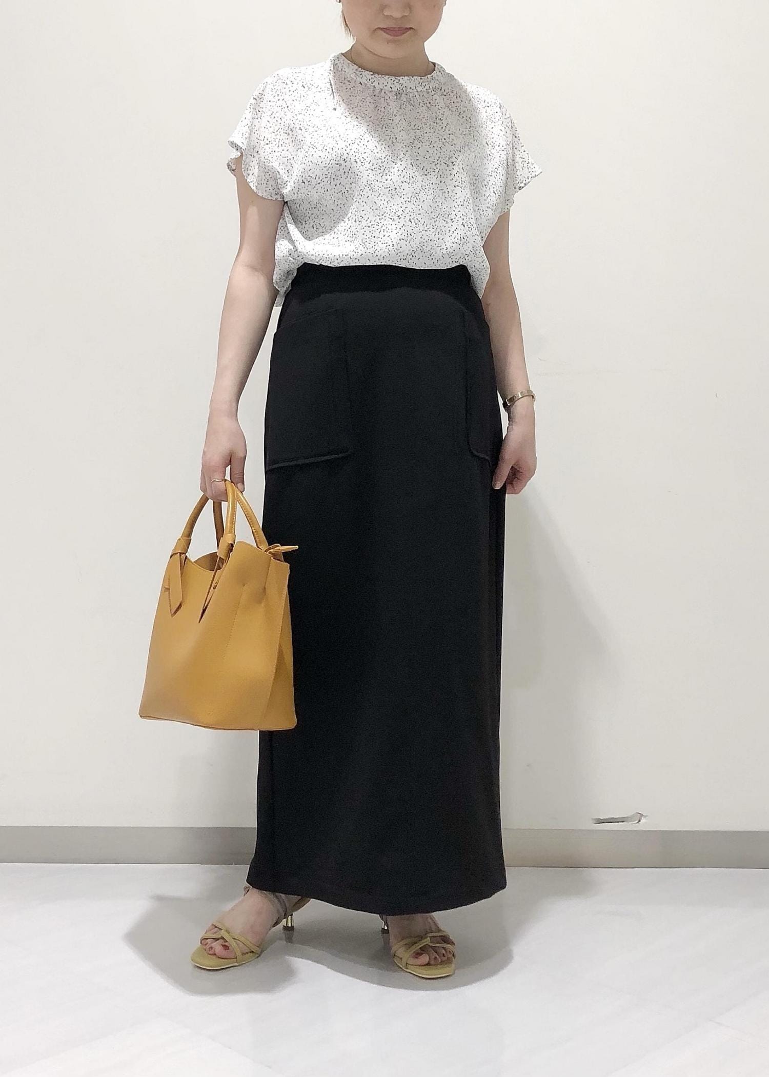 アイラインスカートとブラウスできちんと感のあるスタイリングにしてみました。ボトムはジャージ素材になっているのでカジュアルダウンした印象を取り入れています。 大きめのポケットをアクセントにしたい方は、ブラック以外のカラーがお勧めです◎