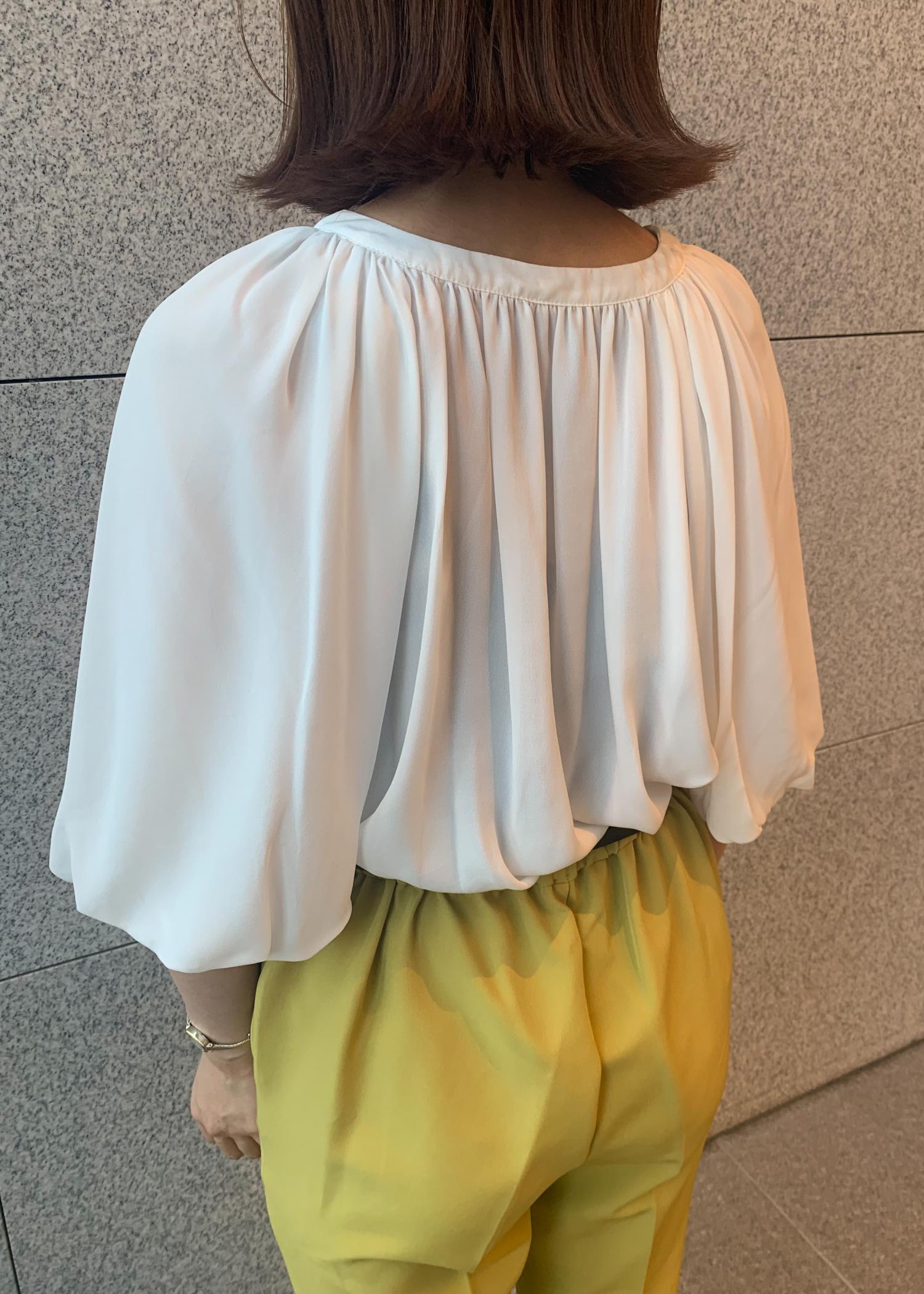 ふんわりとしたシルエットが可愛らしいブラウスは前後2wayになっているので、その時のコーディネートによってイメージを変えて頂けます。カラーパンツを合わせるだけで一気に華やかになるのでコーディネートのアクセントにお勧めです。