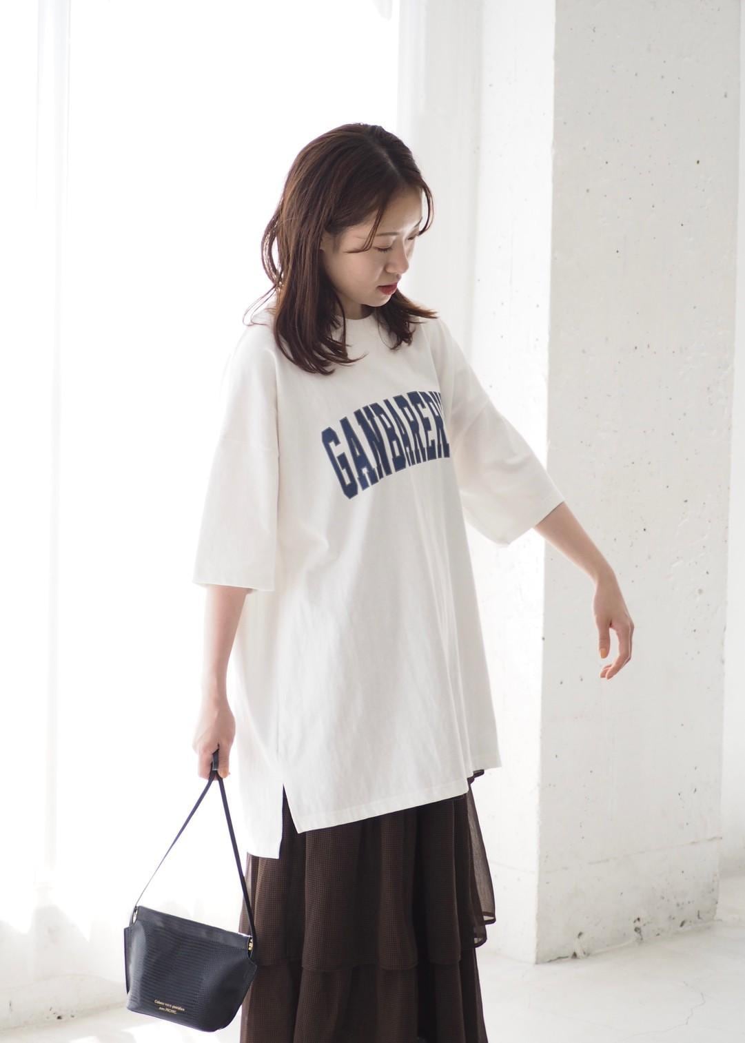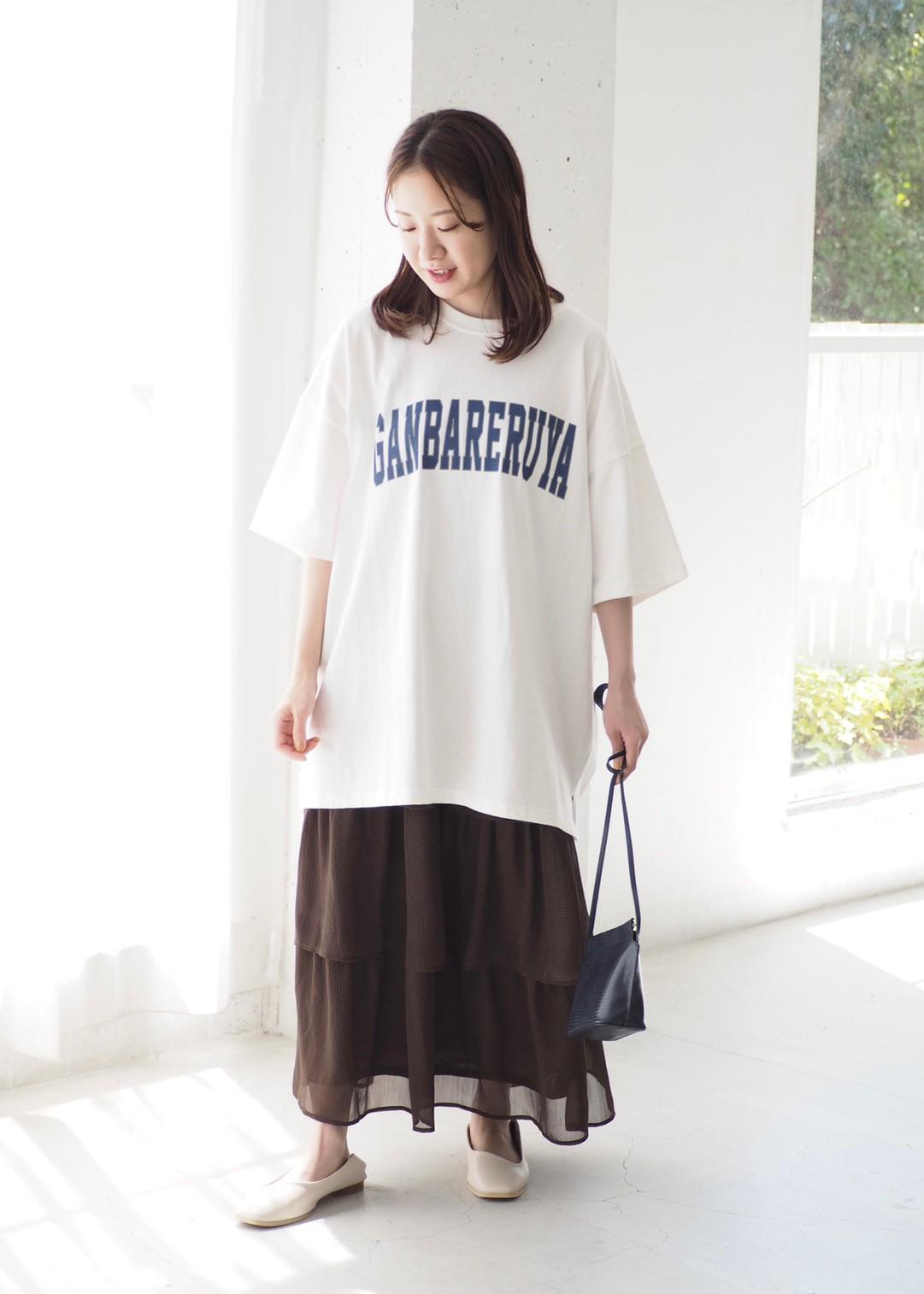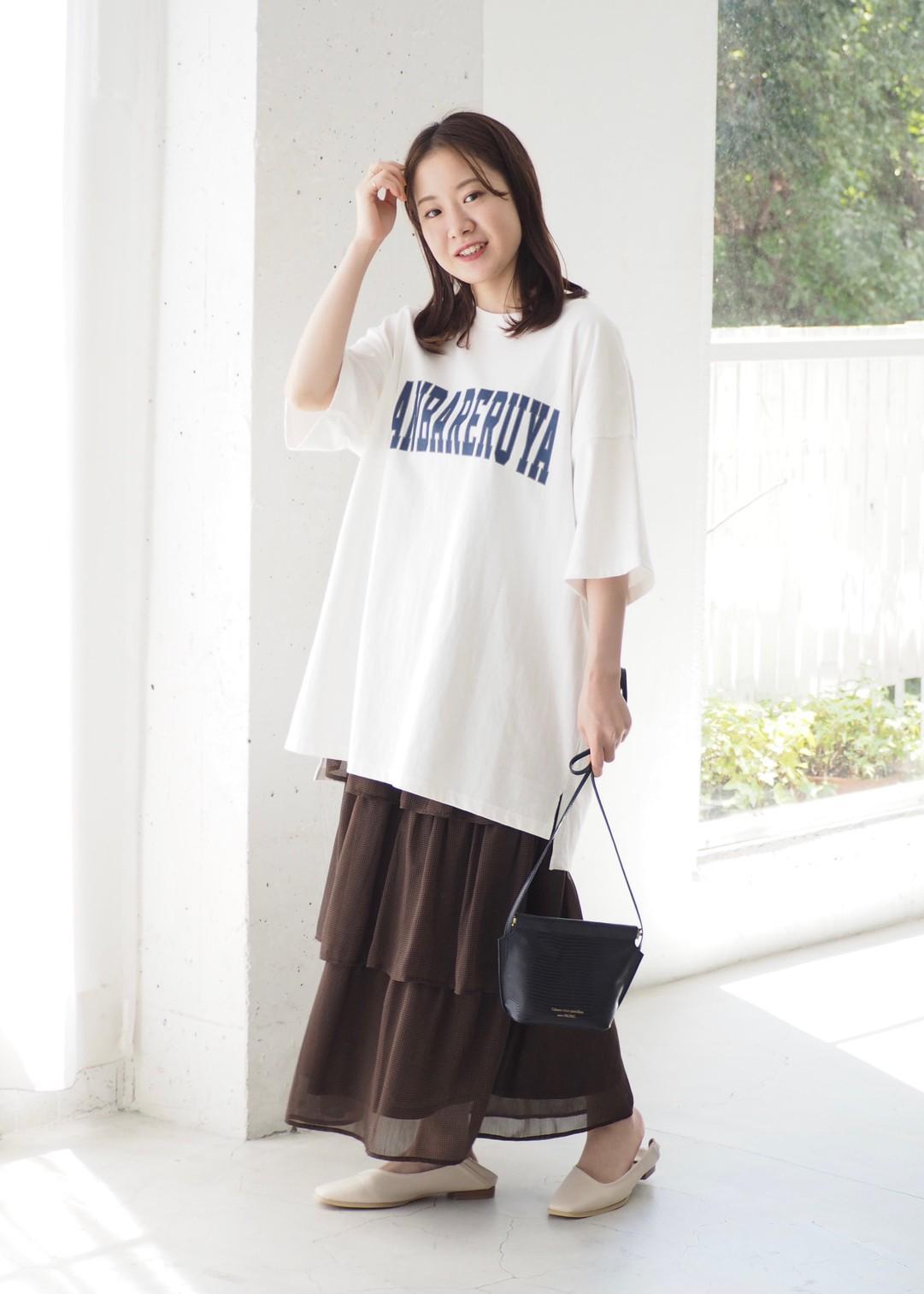 ガンバレルーヤさんとのコラボTシャツと、ティアードスカートで、ラフにスタイリングしました。 スカートを軽い素材のもので合わせると、オーバーサイズのTシャツとマッチします! バブーシュなら、スニーカーよりもカジュアルさが抜けて女性らしくなります♪