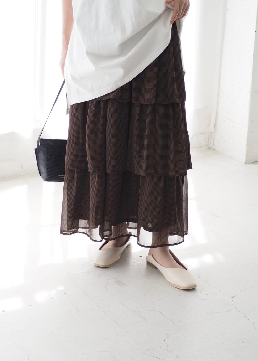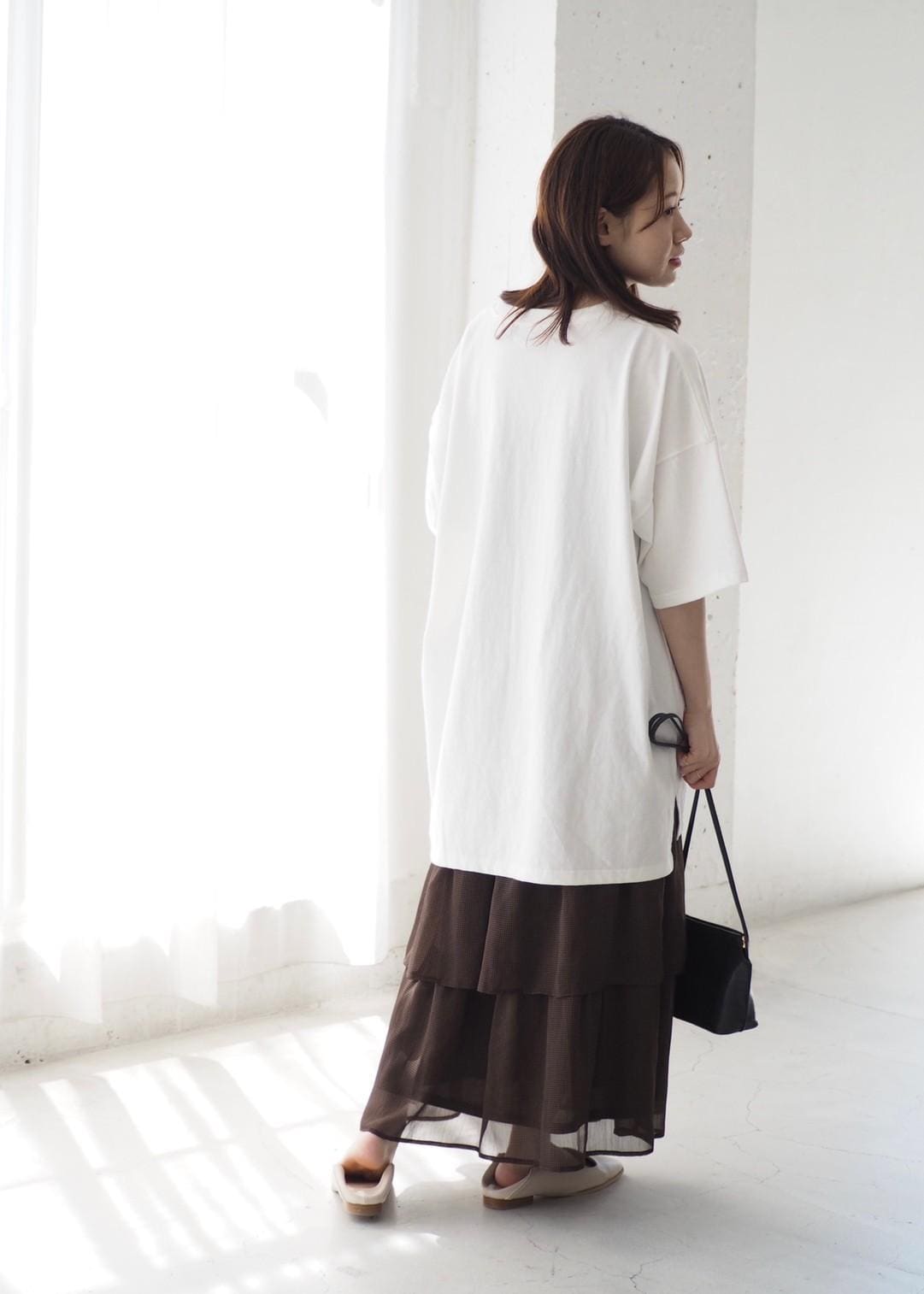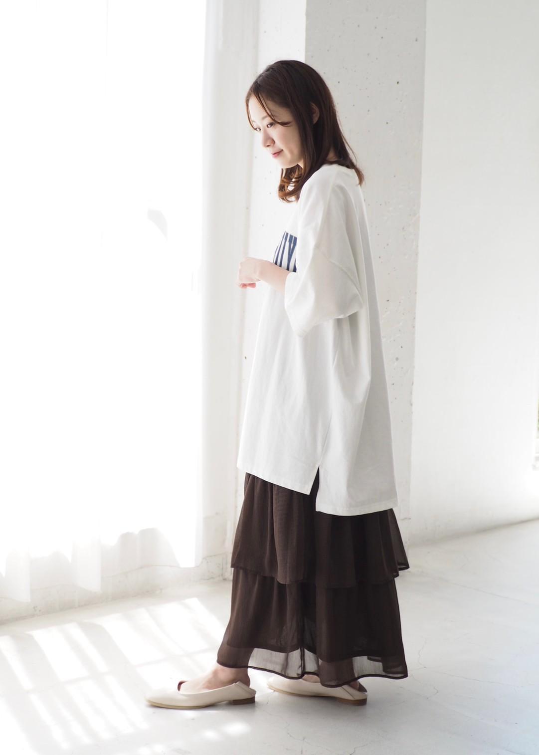 ガンバレルーヤさんとのコラボTシャツと、ティアードスカートで、ラフにスタイリングしました。 スカートを軽い素材のもので合わせると、オーバーサイズのTシャツとマッチします! バブーシュなら、スニーカーよりもカジュアルさが抜けて女性らしくなります♪