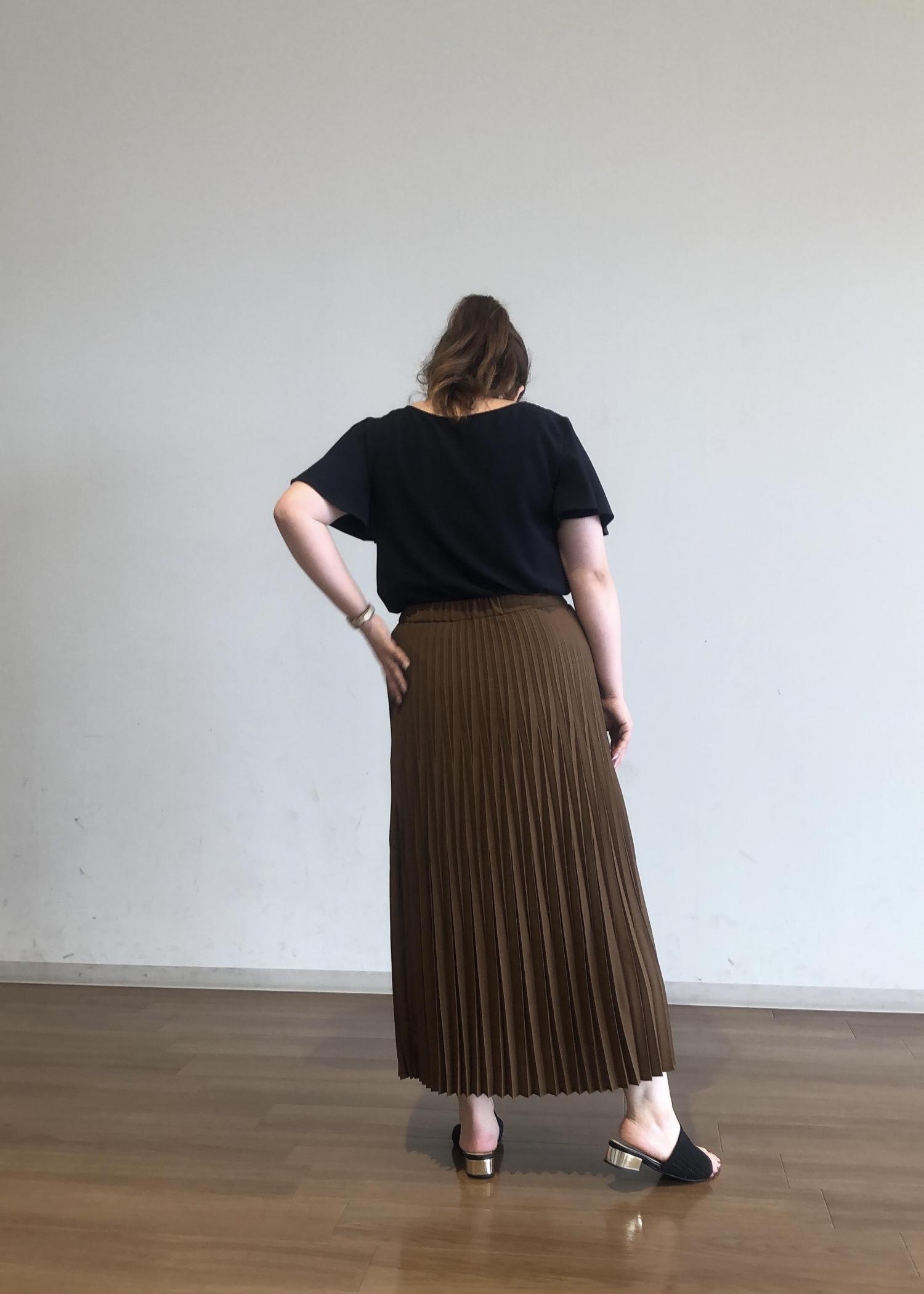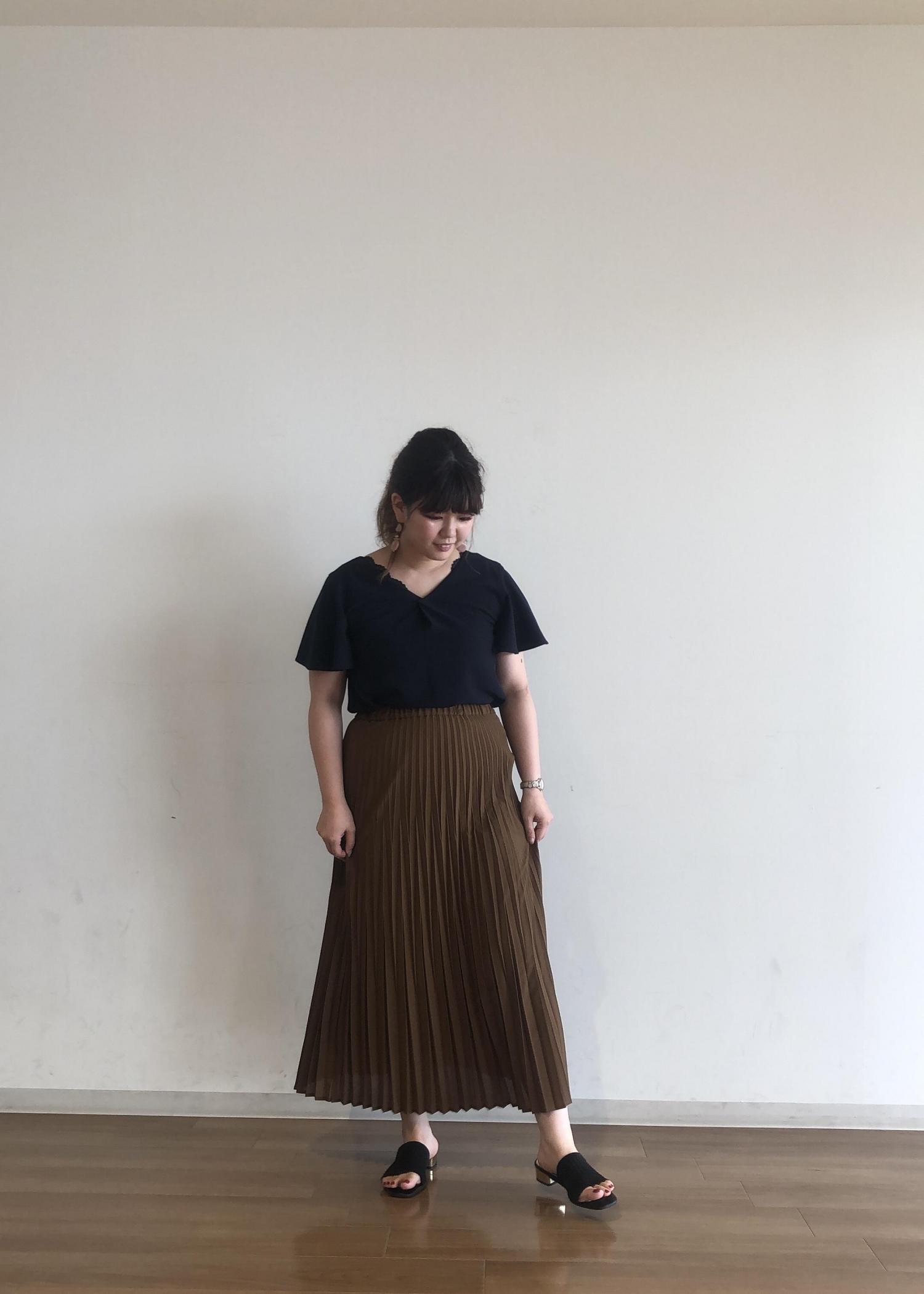 トレンド感のあるプリーツスカートを取り入れたコーディネート。 ネイビー+ブラウンでおとなきれいめな印象となります。 プリーツが女性らしく、縦ラインも入ることでスッキリ、重たすぎない印象で着て頂けますよ!