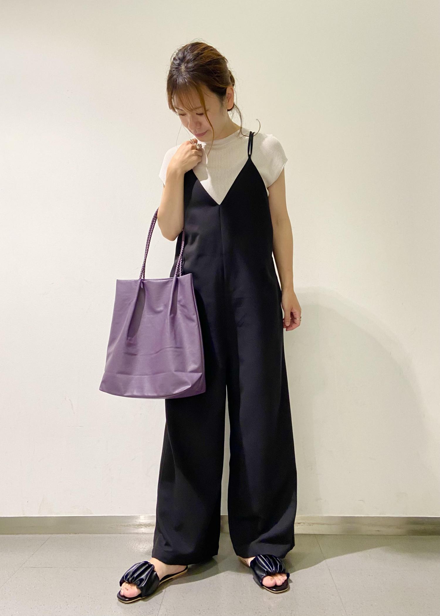 カジュアルにもキレイめにも着れるオールインワンにノースリニットを合わせて少し大人なコーデにしました。 洗えるバッグの新色のパープルのバッグを差し色に使い秋を意識した色合いにしました。