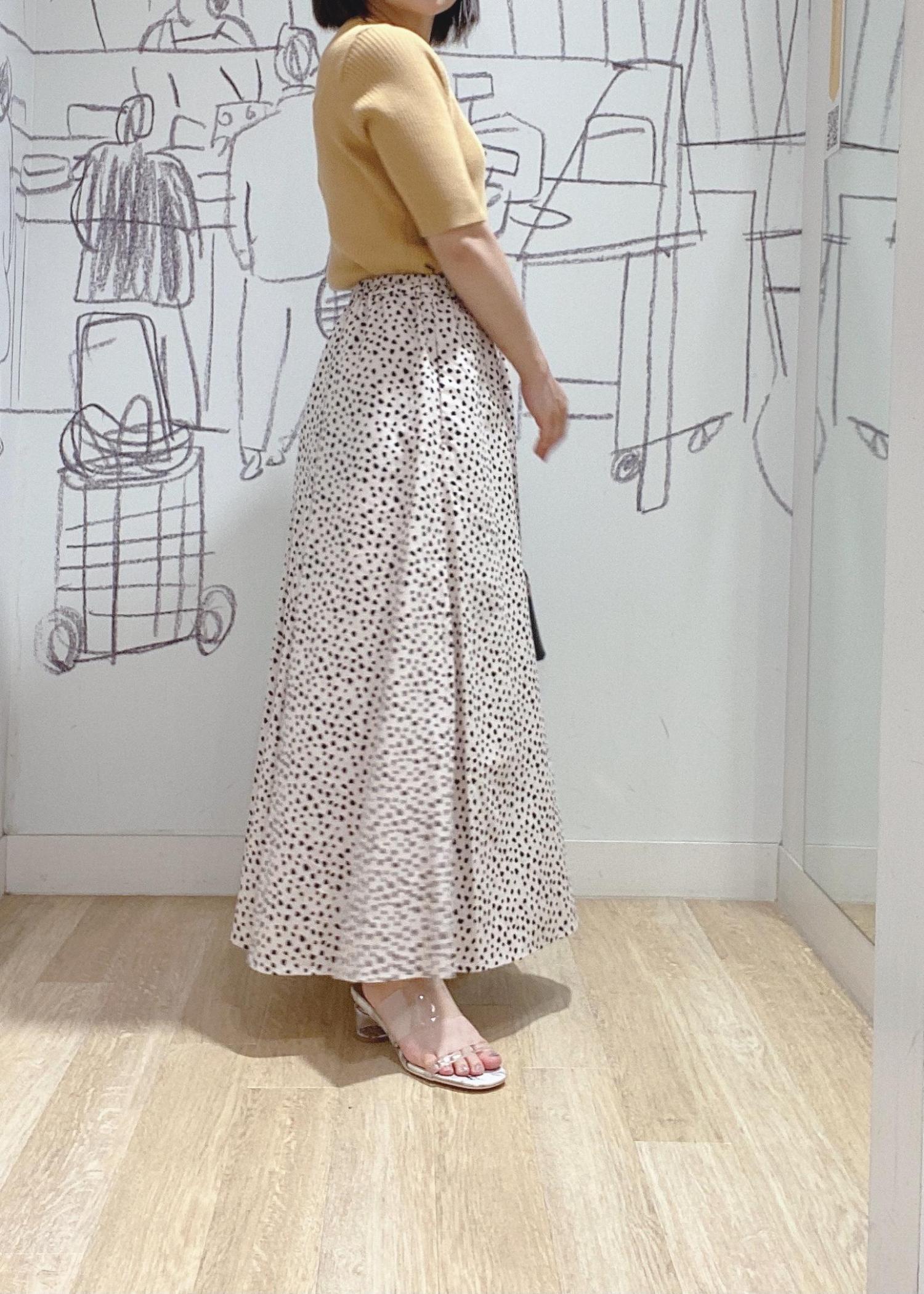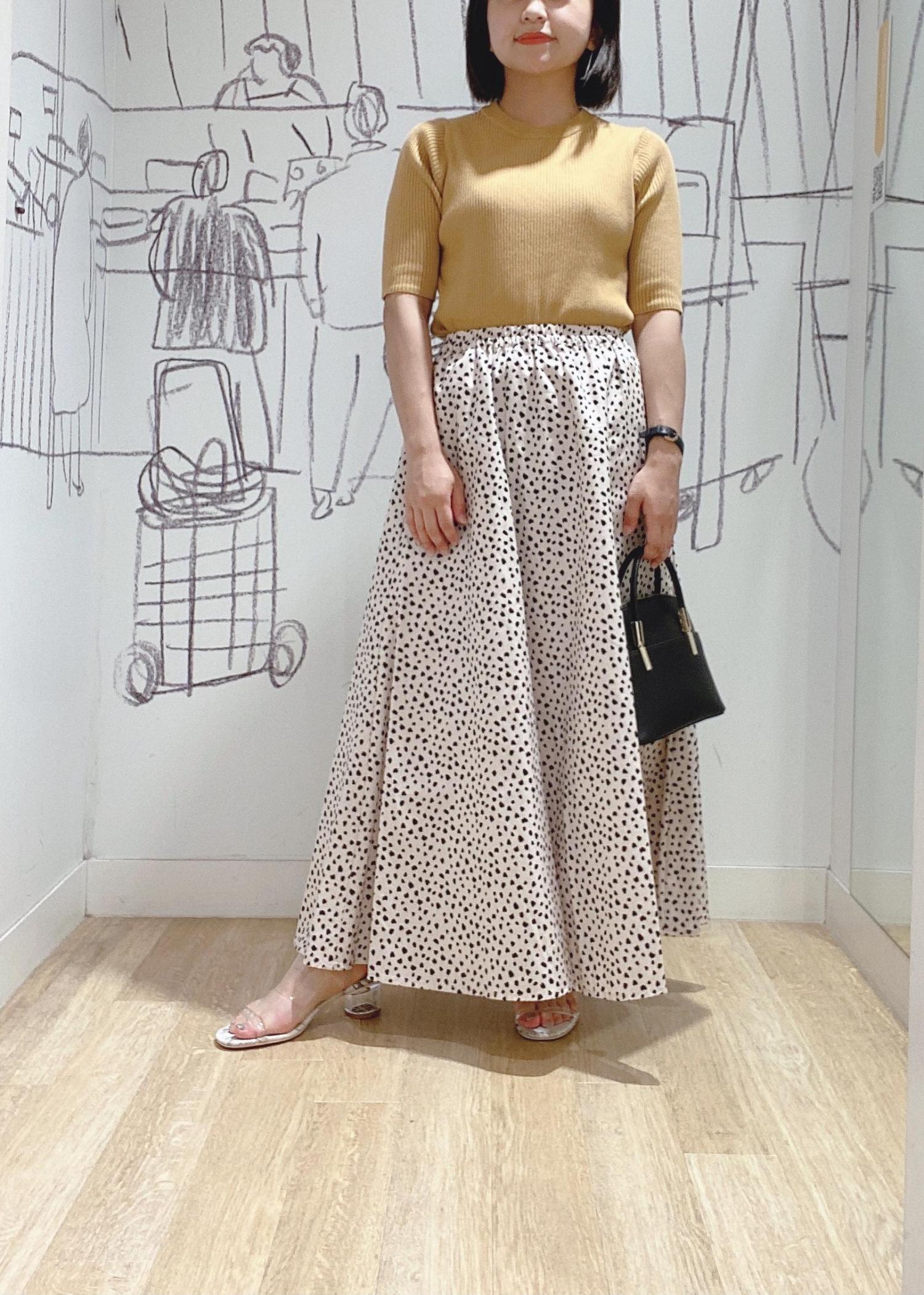 ハリ感がありふわっと広がるシルエットのスカートなので、コンパクトなリブニットと合わせ女性らしいコーディネイトにしました。シンプルなリブニットは着回し抜群です。