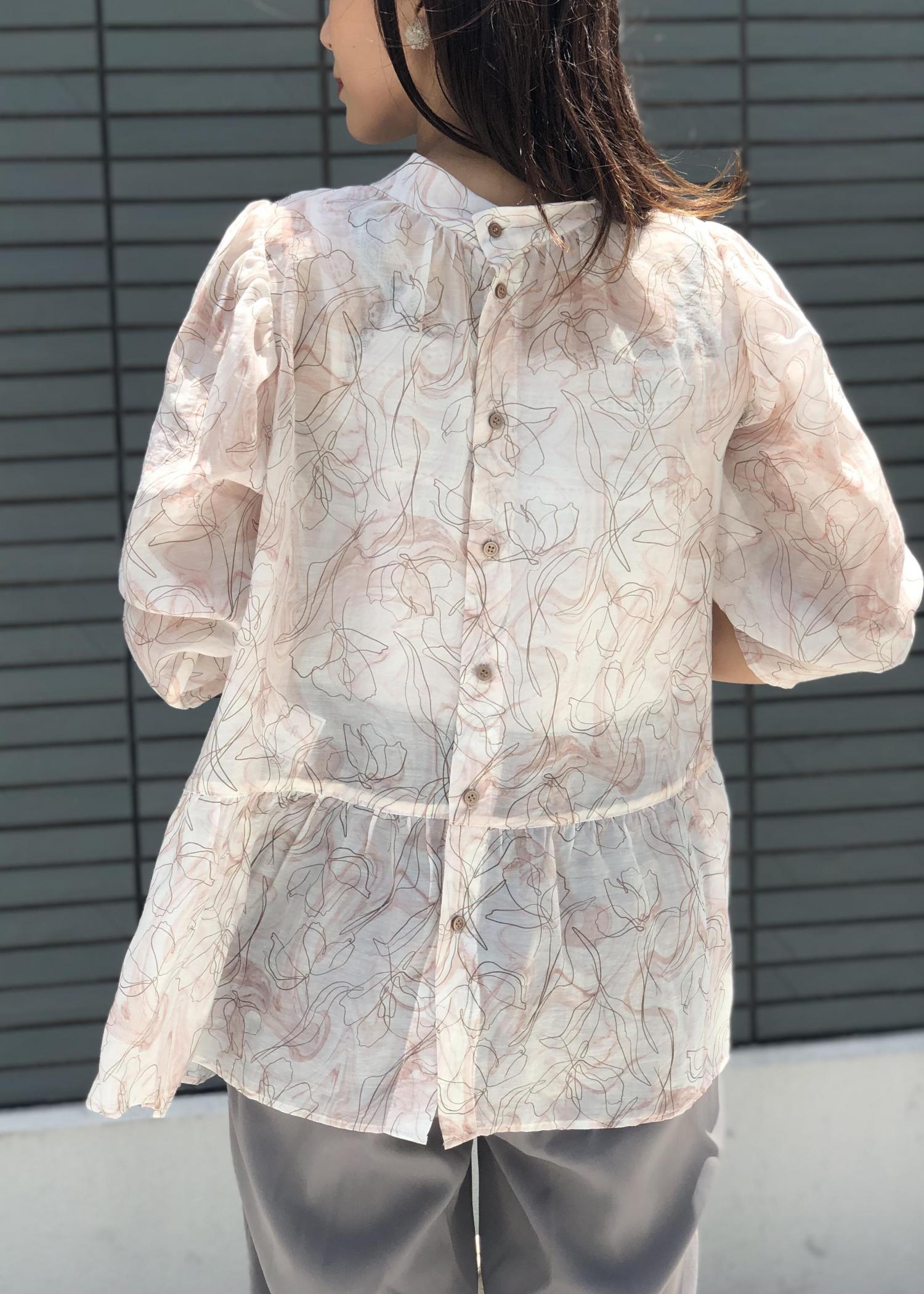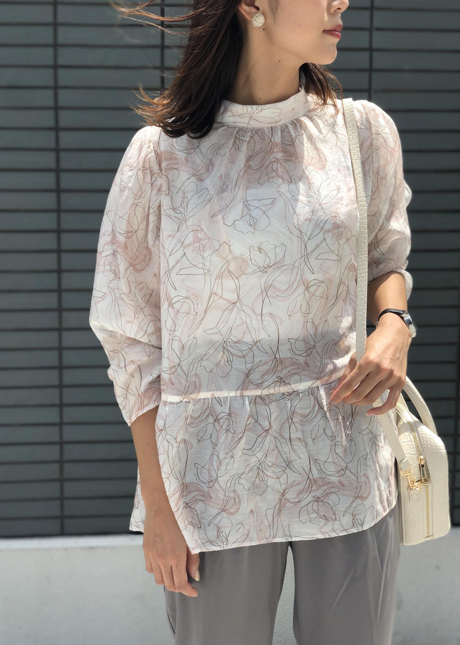 シアーの長袖ブラウスは冷房対策ができるので夏も活躍します! 淡いピンク系のブラウスなのでグレーパンツで締めて大人なキレイめコーデに♪