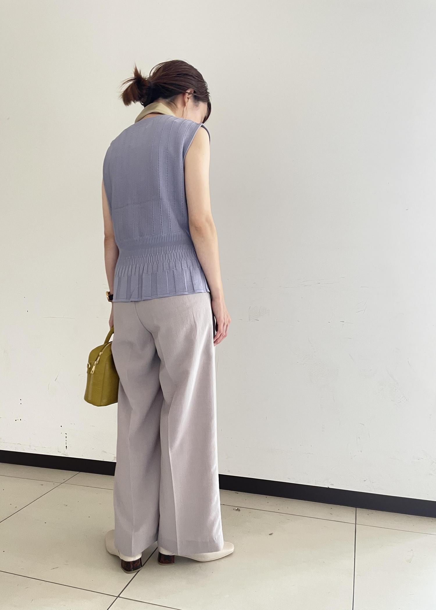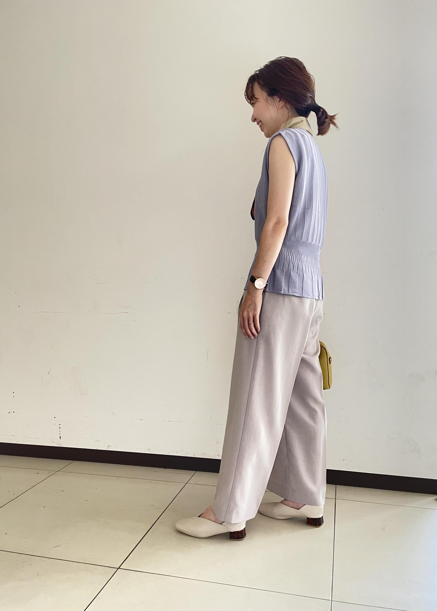 ワイドパンツにウエストフィットしたペプラムトップスを合わせてスタイルアップに。 ラベンダー×カーキにスカーフを合わせ、少し秋を意識した晩夏コーデにもオススメです。