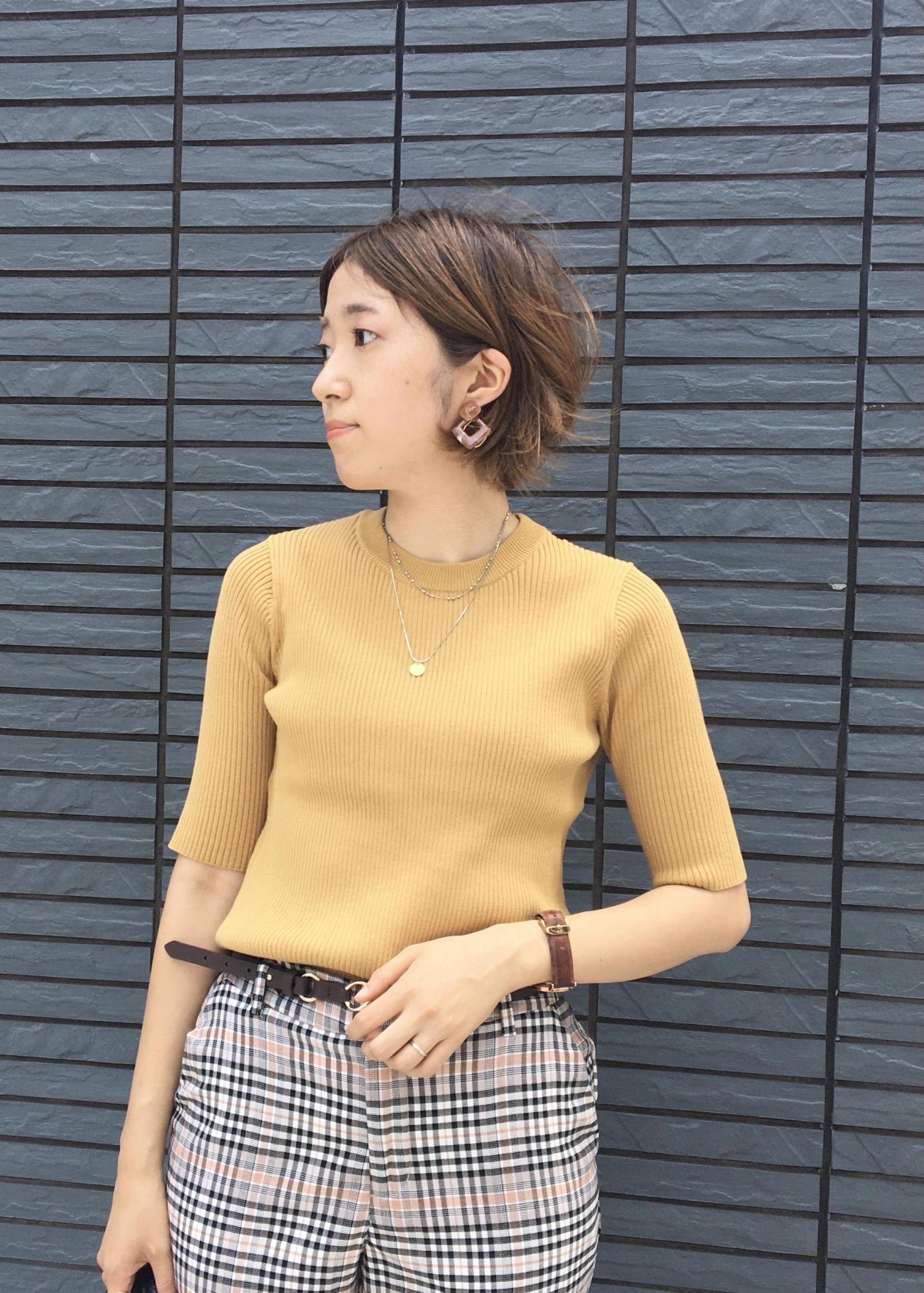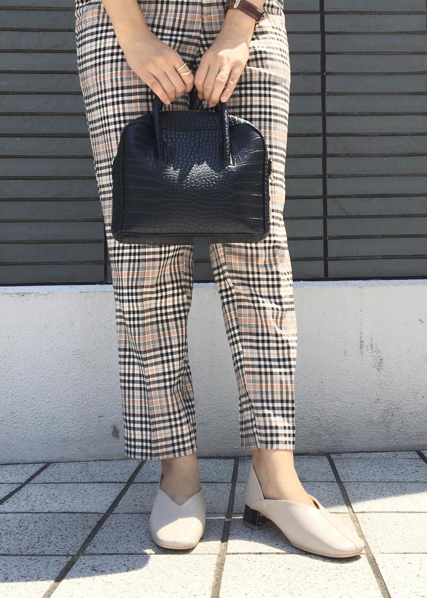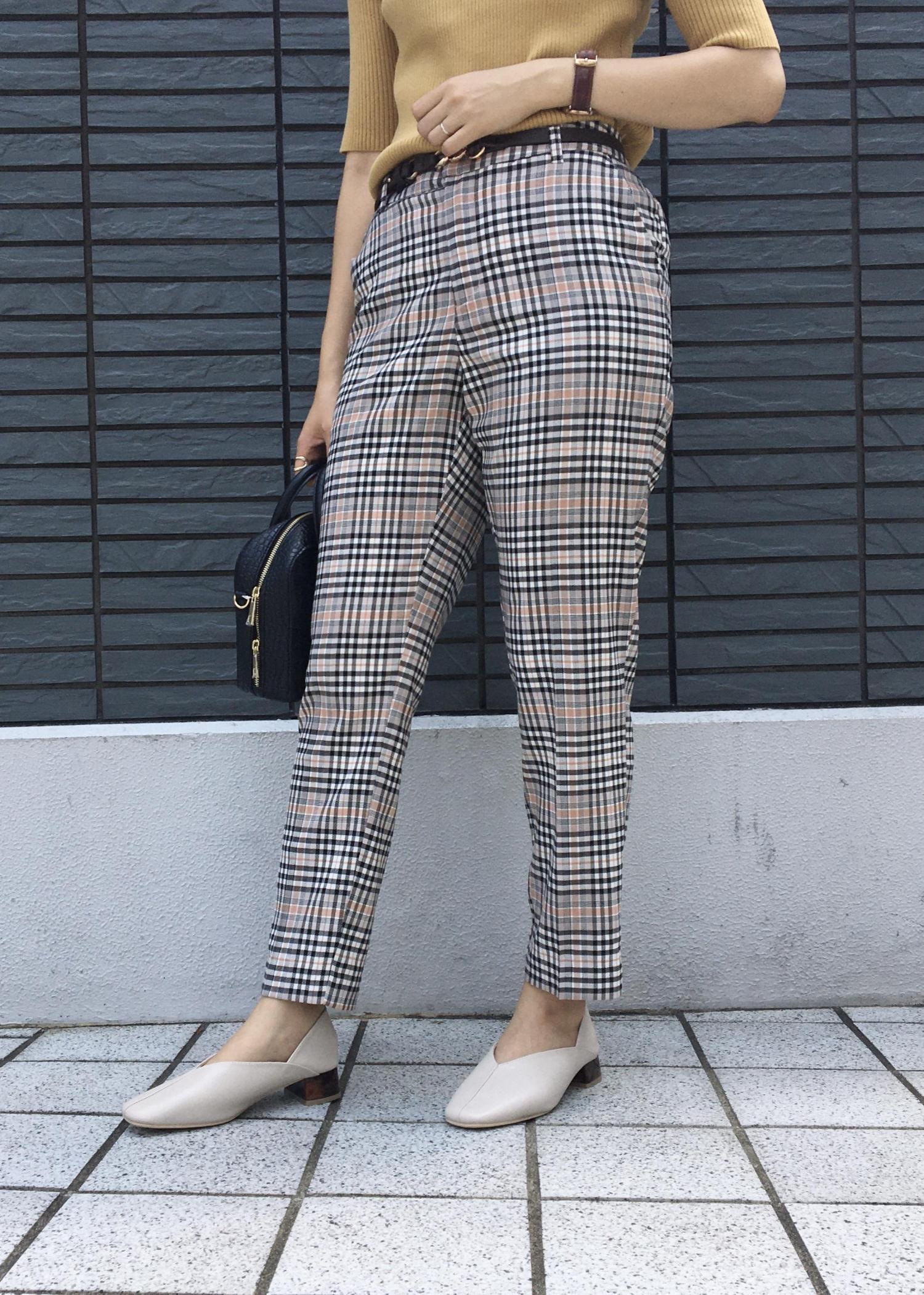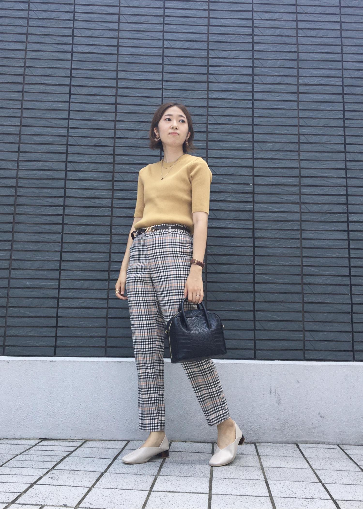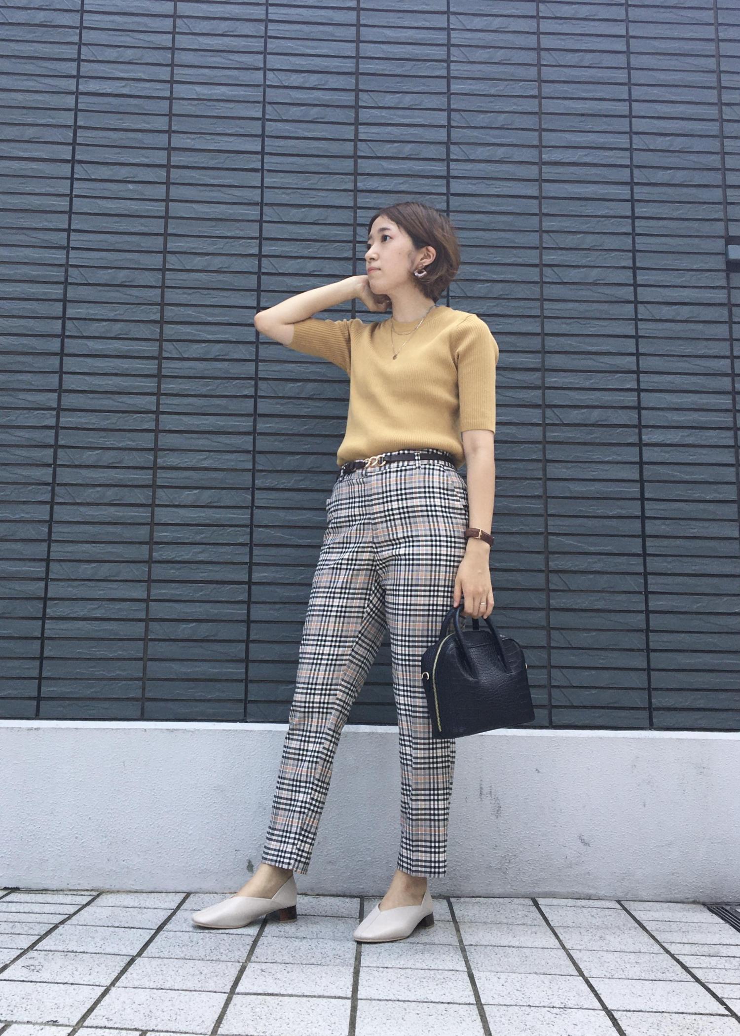 秋カラーを取り入れたコーディネートです。 夏でも快適なオーガニックコットンのリブトップスに、チェックのパンツを合わせて秋の先取りを。 チェック柄ははっきりしたカラーなので、メリハリのあるコーディネートになります。 クロコ型押しのミニボストンとVカットが深めのバブーシュでキチンと感を取り入れました。