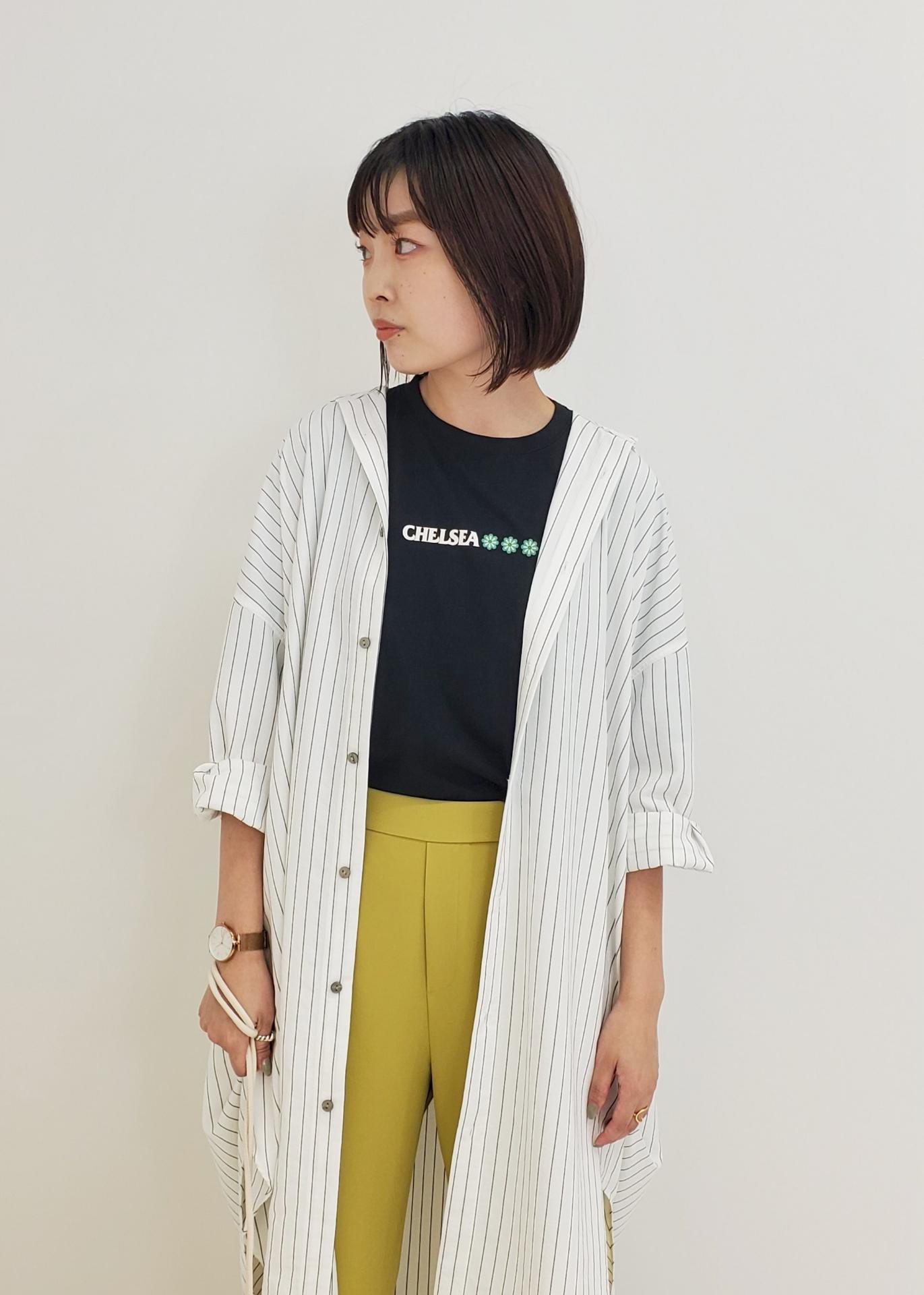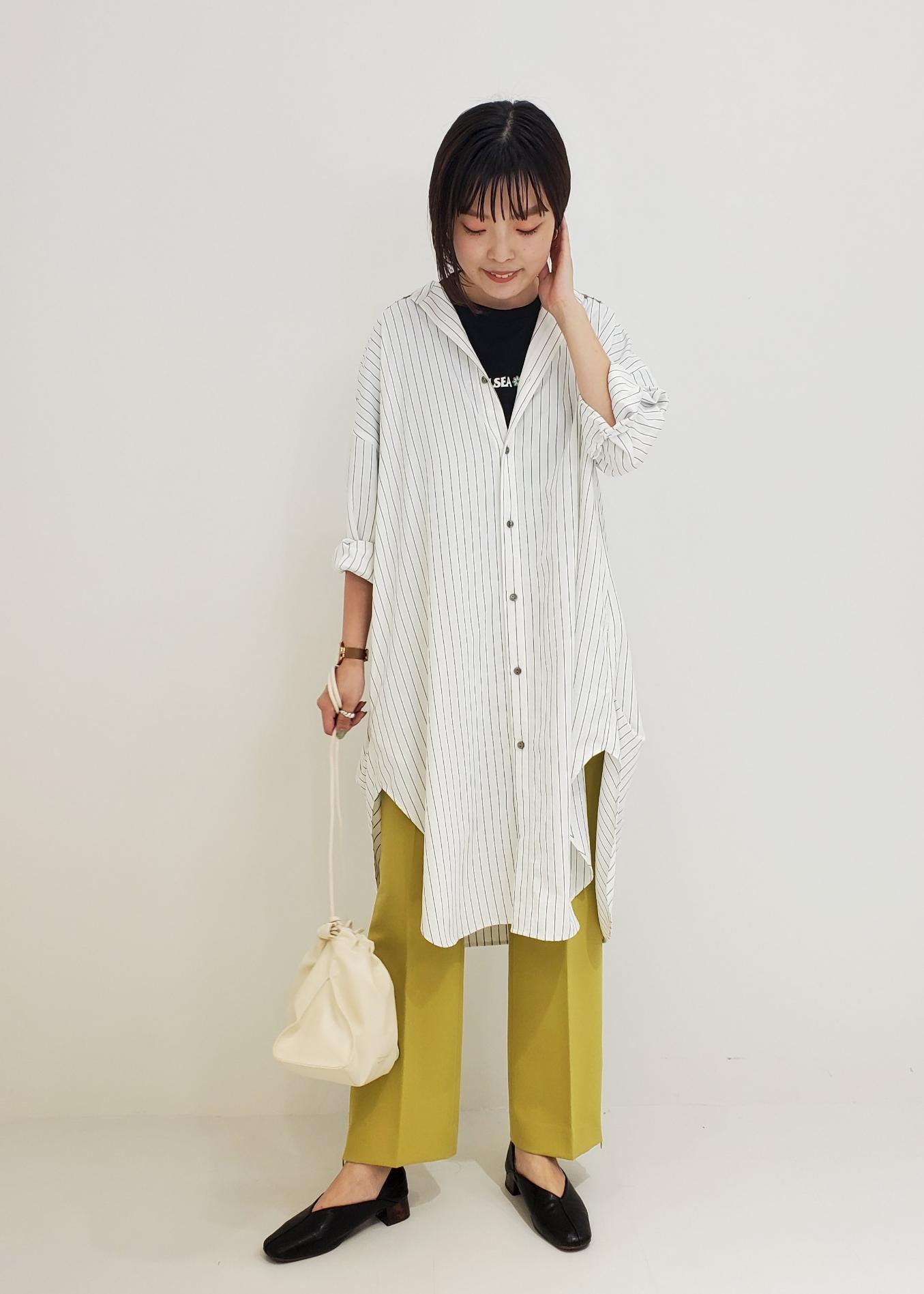 ビックシルエットのシャツワンピも、ストライプ柄で縦にスッキリとした印象に。白のシャツワンピースに合わせるボトムはカラーの映えるものがくると今年らしいですよ。
