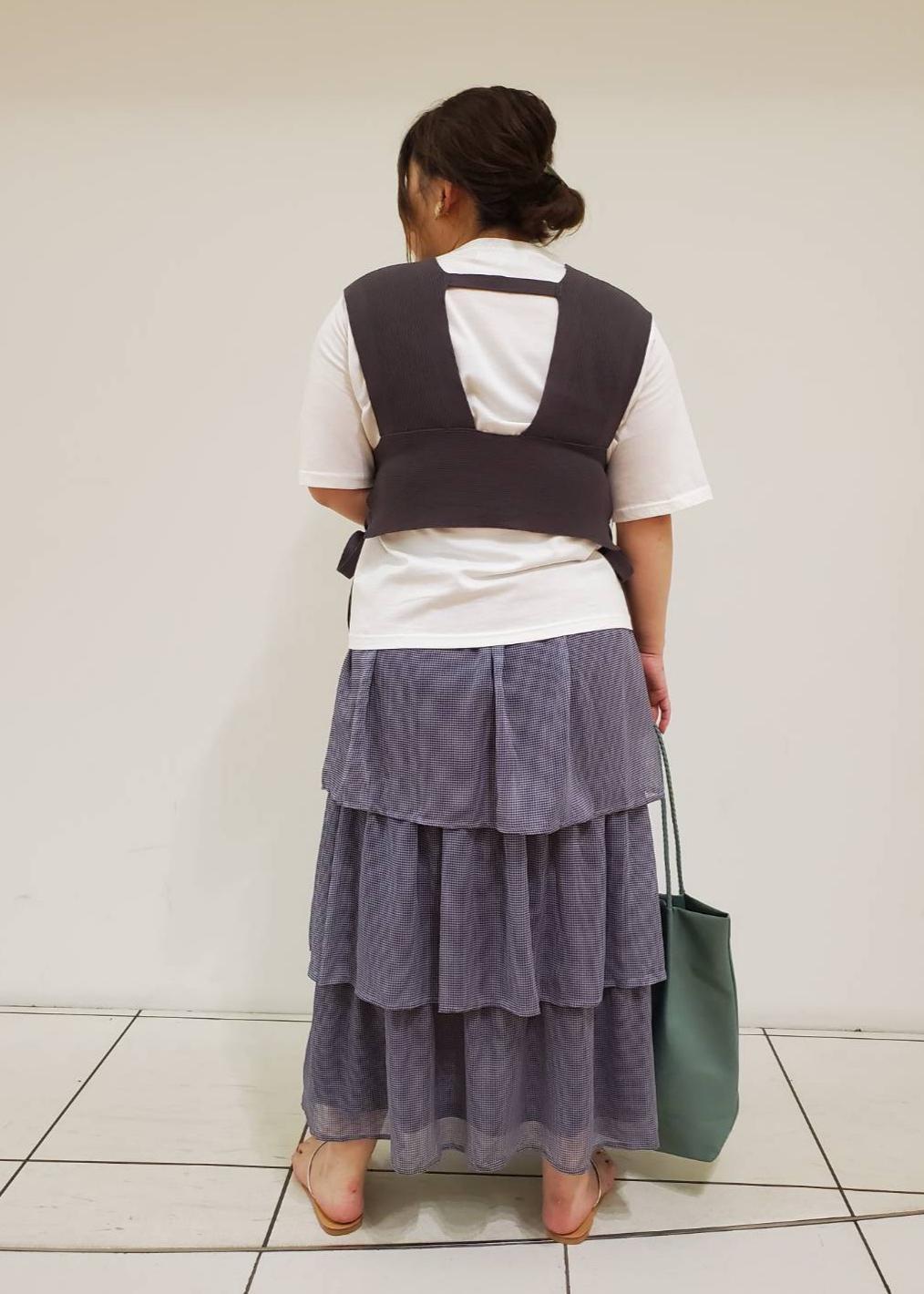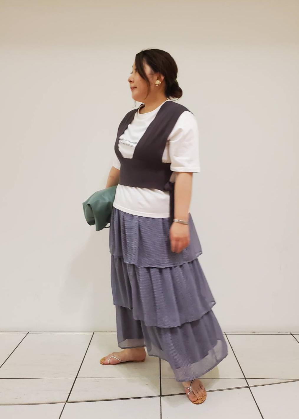 ティアードスカートが女性らしく、可愛いデザインなので あえてロゴTシャツで合わせたカジュアルスタイルです。