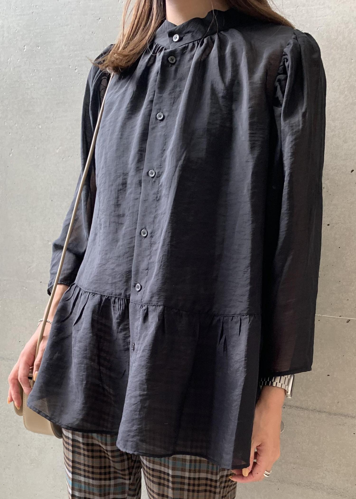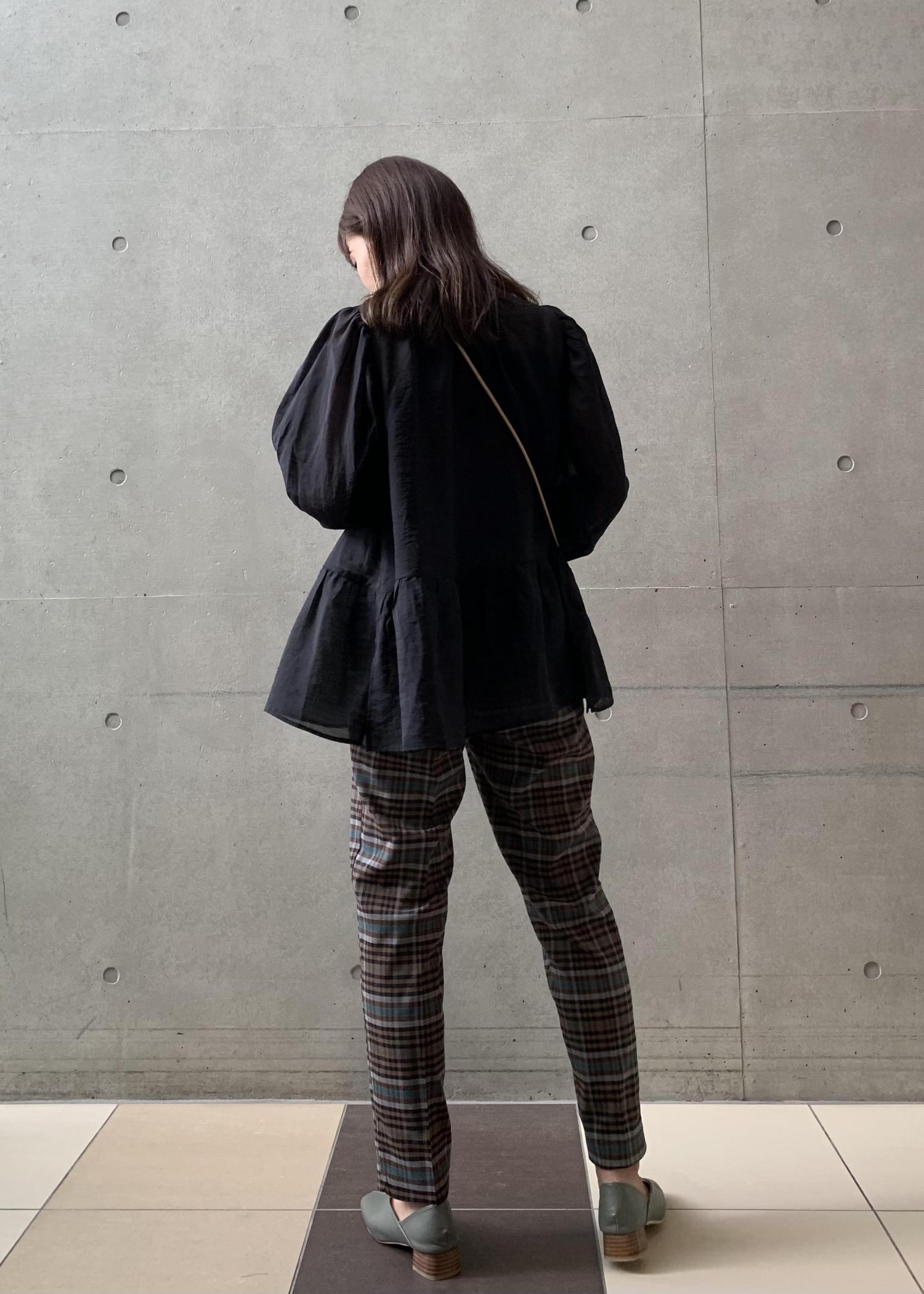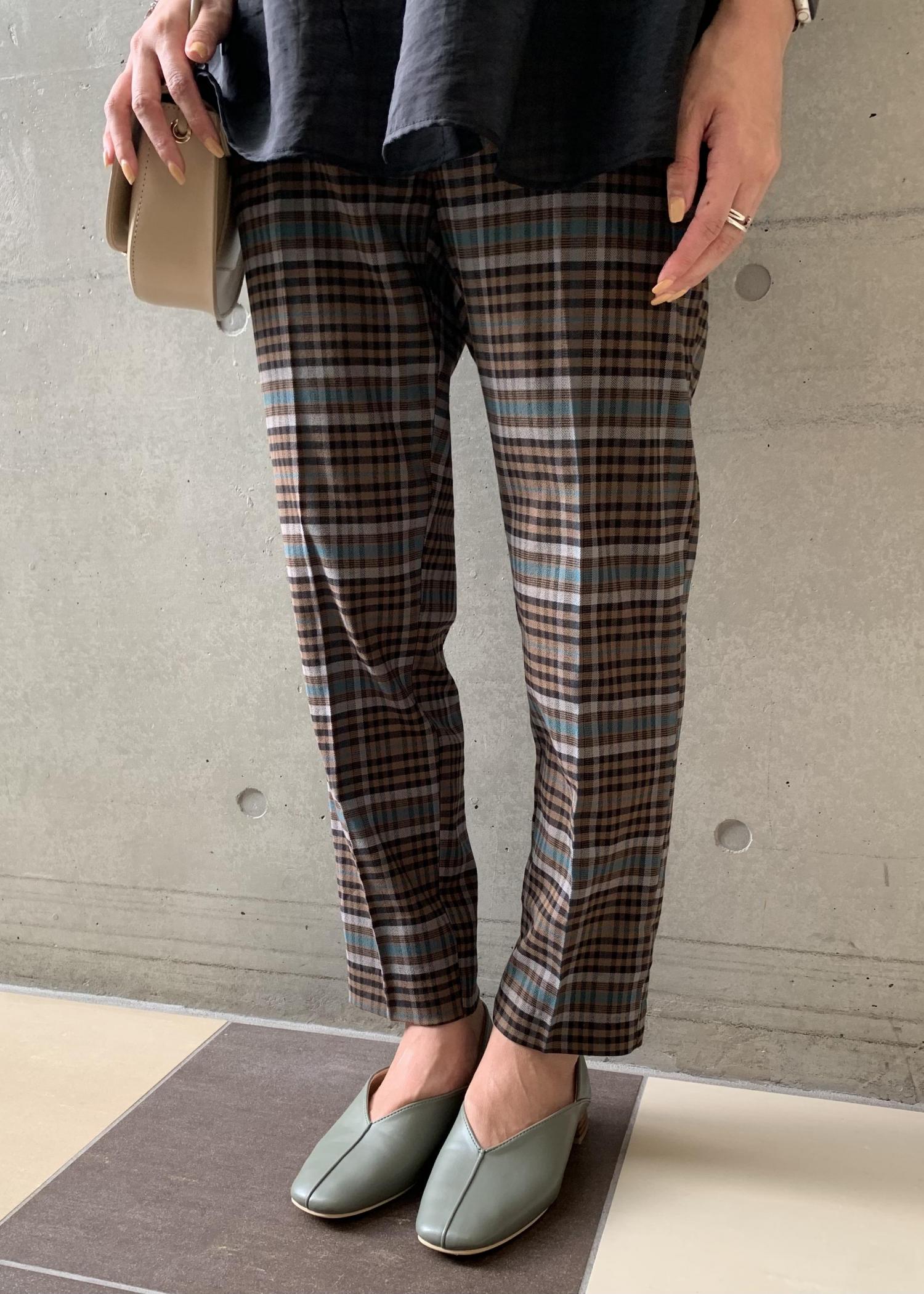 全体的に落ち着いたカラーで仕上げましたが パンツのチェック柄に少しグリーンが入っているので 足元も色味を合わせてみました! 今から秋らしいチェック柄を取り入れてみても◎