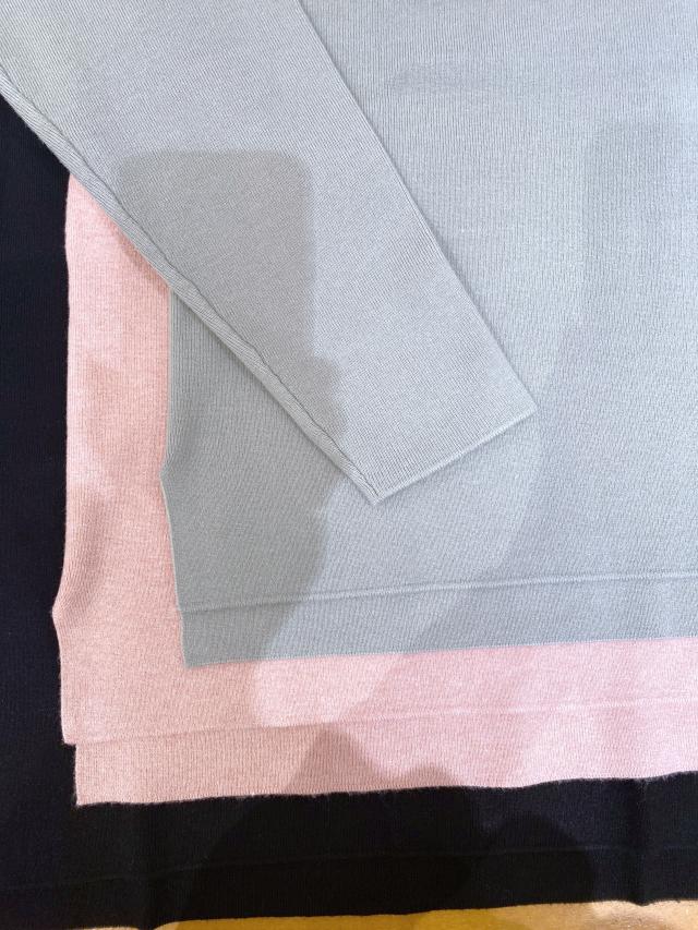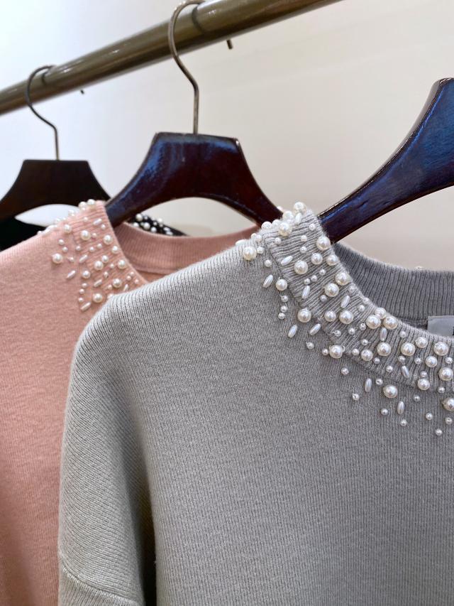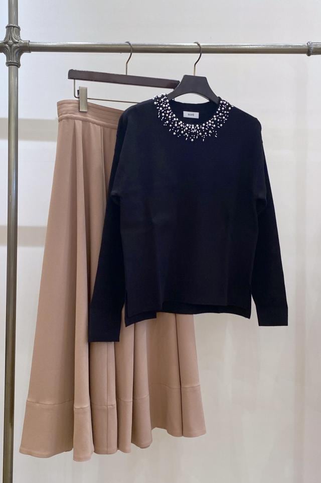襟元にパールをあしらった華やかさのあるニットはイベントの多いこれからの季節にぴったりの1枚です。