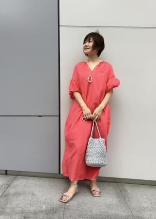マキシ丈のワンピースにボリュームのあるネックレスは夏らしく涼しげでポイントになります。