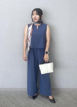 トップス部分のデザインが印象的なオールインワン。目線が上に行き、女性の気になるところを程よくカバーしつつスタイルアップできるので、これからの季節に使いやすいアイテムです。ボトム部分もワイドパンツスタイルなので体のラインを拾わず、ストレスフリーで着用できます。