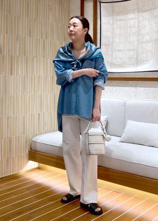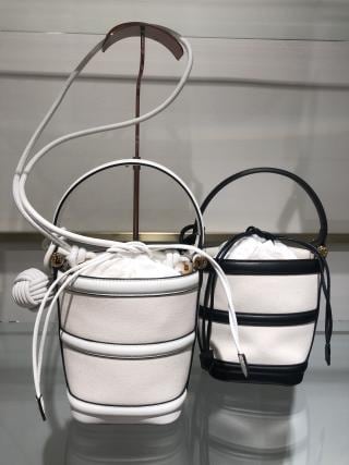 ヨットから着想したバケットバッグ。ボディは船の甲板のイメージ、インバッグは帆からインスピレーションしています。ノットがシグネチャーモチーフです。