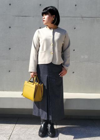モノトーンに落葉樹の木漏れ日のようなマスタードカラーを合わせて、季節の変り目にシックな装いへと導く落ち着いたバイカラー。