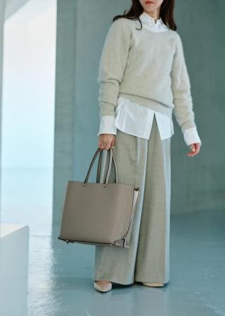 横広なのでものを出し入れしやすいので収納もしやすいです。持ち手をそのまま肩掛けできるようにながめになっており、ショルダーもついているのでシーンにあわせて使い分けできます。