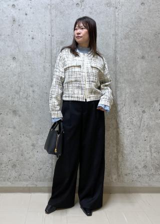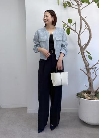 きちんとしたスタイリングは、ワンピースの羽織りやブラウスとスラックスに合わせるとお仕事シーンやお出かけにも活躍します。
