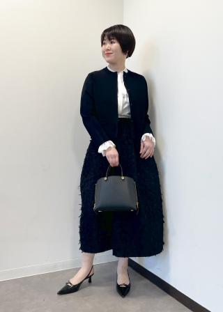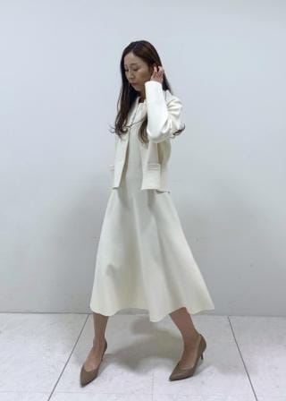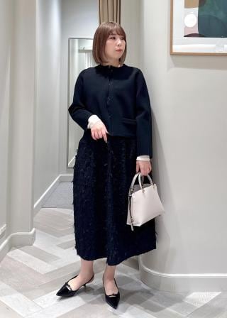 同素材のワンピース(品番:GGE25040)とのアンサンブルでセレモニースタイルとして着ていただくのもおすすめです。また、ワイドパンツやフレアースカートなど異素材と合わせたスタイリングも映えます。オンオフどちらのシーンでも活躍する一着です。