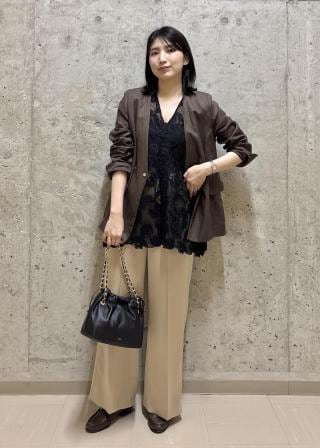 ノーカラーの首元からフリルブラウスを覗かせれば、より一層フェミニンで洗練された印象に仕上がります。