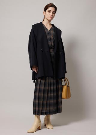 クラシカル且つ大胆なビッグチェックは、オリジナルで作った拘りの柄です。裏面を無地ネイビーにしておりアクセントに。日本の尾州で織られたSUPER100(18.5ミクロン)の原毛を使用したふくらみとしなやかさを両立したエアリーな風合いが特徴。また繊維長の長い18.5ミクロンの原毛を使用しているため、深い起毛で長めに毛足を出した後にショートに毛足を刈り揃えており、毛並みや密度の細かいきれいな表面感になっています。