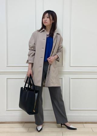 キレイ目素材でジャケットの上からも羽織れるサイズ感なのでオンオフどちらのシーンでも活躍するコートです。同シリーズのポケット付きタイトスカートとのコートアップスタイルも今シーズンはお勧めです。