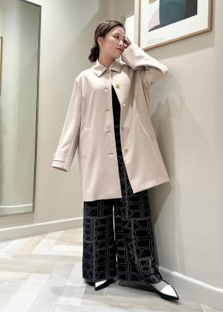 キレイ目素材でジャケットの上からも羽織れるサイズ感なのでオンオフどちらのシーンでも活躍するコートです。同シリーズのポケット付きタイトスカートとのコートアップスタイルも今シーズンはお勧めです。