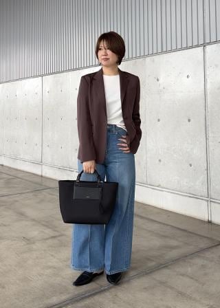 同素材のパンツ・ブラウスと合わせた3点セットのスタイリングがおすすめ。