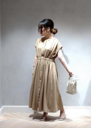 ギャザーがたっぷりと入った比翼仕立ての前開きワンピース。少し肩にかかるくらいのフレンチスリーブで腕がすっきりと見えます。上品でクラス感のあるアイテムです。