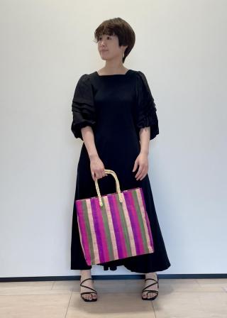 ブラックでシックなイメージも夏らしいカラフルなマルチストライプのバッグで抜け感を出してみました。