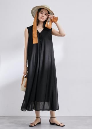 歩くとふわっとしたシルエットが出るAラインのマキシワンピース。今年は前立てに小さなくるみ釦を並べたデザイン。前後2WAYで着用できます。1枚でさらっと着たい夏にピッタリのワンピースです。