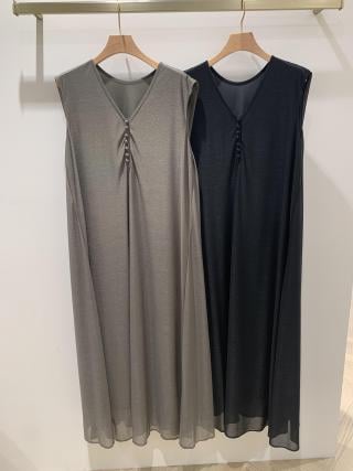 大き目のアクセサリーやスカーフ、サンダルと合わせてとことん夏らしいコーディネートを楽しんでほしいです。ラミージャケットを羽織っても素敵です。店頭では、エスパンディワンピースの羽織に、ビット付きカーディガン(品番:GGK23380)などカーディガンやジャケットを合わせた+羽織りのスタイリングが人気。