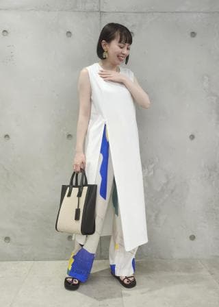 ファスナーをウエストからヒップ下くらいまで開けて、同色系でのカラープリーツスカート(品番:GGC24300)との合わせがお勧めです。新しいプリーツスカートの着こなしとしてお勧めしてください。また、ワイドパンツとの合わせもバリエーションとしてお勧めです。オフホワイトにはペチコートを着用していただければ、問題なく1枚着としても着用できます。